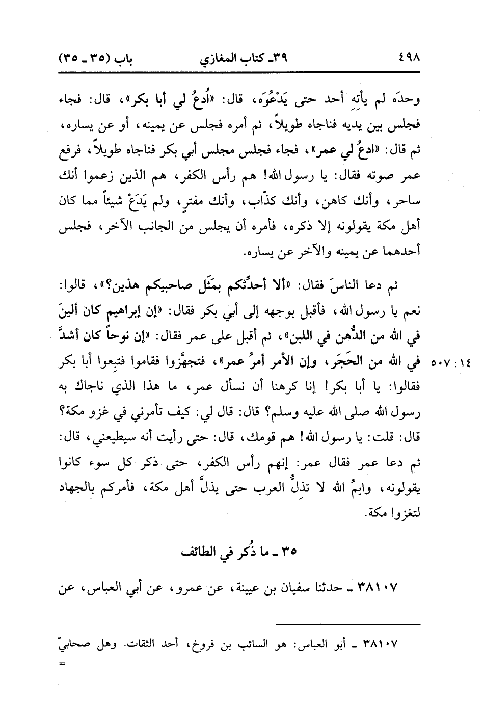 ثُمَّ دَعَا النَّاسَ ، فَقَالَ : أَلاَ أُحَدِّثُكُمْ بِمِثْلِ صَاحِبَيْكُمْ هَذَيْنِ ؟ قَالَوا : نَعَمْ ، يَا رَسُولَ اللهِ ، فَأَقْبَلَ بِوَجْهِهِ إِلَى أَبِي بَكْرٍ ، فَقَالَ : إِنَّ إبْرَاهِيمَ كَانَ أَلْيَنَ فِي اللهِ مِنَ الدُّهْنِ فِي اللَّبَنِ ، ثُمَّ أَقْبَلَ عَلَى عُمَرَ ، فَقَالَ : إِنَّ نُوحًا كَانَ أَشَدَّ (14/506) فِي اللهِ مِنَ الْحَجَرِ ، وَإِنَّ الأَمْرَ أَمْرُ عُمَرَ ، فَتَجَهَّزُوا ، فَقَامُوا فَتَبِعُوا أَبَا بَكْرٍ ، فَقَالُوا : يَا أَبَا بَكْرٍ ، إِنَّا كَرِهْنَا أَنْ نَسْأَلَ عُمَرَ ، مَا هَذَا الَّذِي نَاجَاك بِهِ رَسُولُ اللهِ صَلَّى الله عَلَيْهِ وَسَلَّمَ ؟ قَالَ : قَالَ لِي : كَيْفَ تَأْمُرُونِي فِي غَزْوِ مَكَّةَ ؟ قَالَ : قُلْتُ : يَا رَسُولَ اللهِ ، هُمْ قَوْمُك ، قَالَ : حَتَّى رَأَيْتُ أَنَّهُ سَيُطِيعُنِي ، قَالَ : ثُمَّ دَعَا عُمَرَ ، فَقَالَ عُمَرُ : إِنَّهُمْ رَأْسُ الْكُفْرِ ، حَتَّى ذَكَرَ كُلَّ سُوءٍ كَانُوا يَذْكُرُونَهُ ، وَأَيْمُ اللهِ لاَ تَذِلُّ الْعَرَبُ حَتَّى يَذِلَّ أَهْلُ مَكَّةَ ، فَأَمُرَكُمْ بِالْجِهَادِ لِتَغْزُوا مَكَّةَ. (14/507).