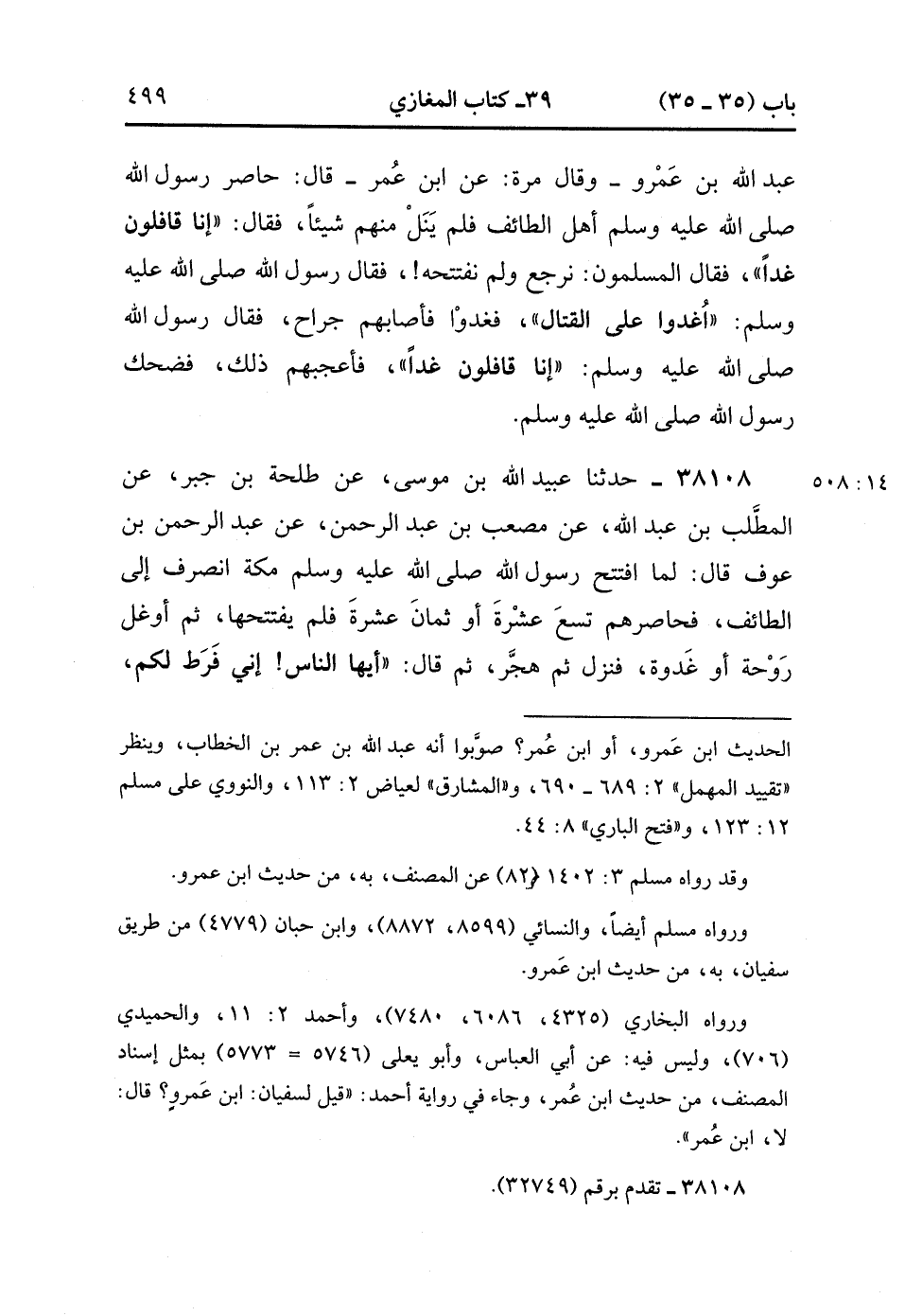 38108- حَدَّثَنَا عُبَيْدُ اللهِ بْنُ مُوسَى ، عَنْ طَلْحَةَ بْنِ جَبْرٍ ، عَنِ الْمُطَّلِبِ بْنِ عَبْدِ اللهِ ، عَنْ مُصْعَبِ بْنِ عَبْدِ الرَّحْمَنِ ، عَنْ عَبْدِ الرَّحْمَنِ بْنِ عَوْفٍ ، قَالَ : لَمَّا افْتَتَحَ رَسُولُ اللهِ صَلَّى الله عَلَيْهِ وَسَلَّمَ مَكَّةَ انْصَرَفَ إِلَى الطَّائِفِ ، فَحَاصَرَهُمْ تِسْعَ عَشْرَةَ ، أَوْ ثَمَانِ عَشْرَةَ فَلَمْ يَفْتَتِحْهَا ، ثُمَّ أَوْغَلَ رَوْحَةً ، أَوْ غَدْوَةً ، فَنَزَلَ ، ثُمَّ هَجَّرَ ، ثُمَّ قَالَ : أَيُّهَا النَّاسُ ، إِنِّي فَرَطٌ لَكُمْ ، فَأُوصِيكُمْ بِعِتْرَتِي خَيْرًا ، وَإِنَّ مَوْعِدَكُمُ الْحَوْضُ ، وَالَّذِي نَفْسِي بِيَدِهِ ، لَتُقِيمُنَّ الصَّلاَةَ وَلتُؤْتُنَّ الزَّكَاةَ ، أَوْ لأَبْعَثَنَّ إِلَيْكُمْ رَجُلاً مِنِّي ، أَوْ كَنَفْسِي ، فَلَيَضْرِبَنَّ أعَنْاقَ مُقَاتِلَتِهِمْ وَلَيَسْبِيَنَّ ذَرَارِيَّهُمْ ، قَالَ : فَرَأَى النَّاسُ أَنَّهُ أَبُو بَكْرٍ ، أَوْ عُمَرُ ، فَأَخَذَ بِيَدِ عَلِيٍّ ، فَقَالَ : هَذَا. (14/508).