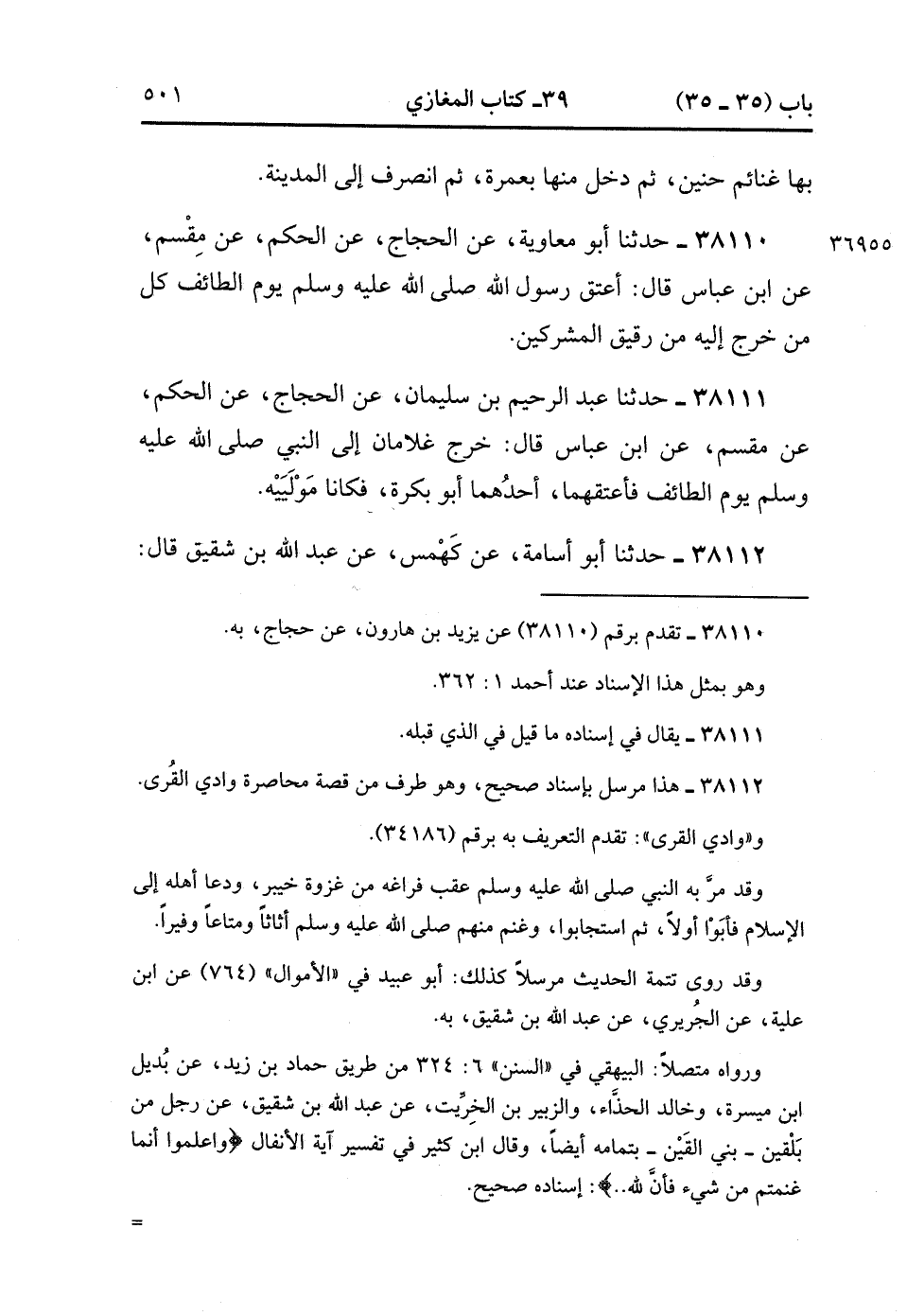 38111- حَدَّثَنَا عَبْدُ الرَّحِيمِ بْنُ سُلَيْمَانَ ، عَنِ الْحَجَّاجِ ، عَنِ الْحَكَمِ ، عَنْ مِقْسَمٍ ، عَنِ ابْنِ عَبَّاسٍ ، قَالَ : خَرَجَ غُلاَمَانِ إِلَى النَّبِيِّ صَلَّى الله عَلَيْهِ وَسَلَّمَ يَوْمَ الطَّائِفِ فَأَعْتَقَهُمَا ، أَحَدُهُمَا أَبُو بَكْرَةَ ، فَكَانَا مَوْلَيَيْهِ. (14/509).