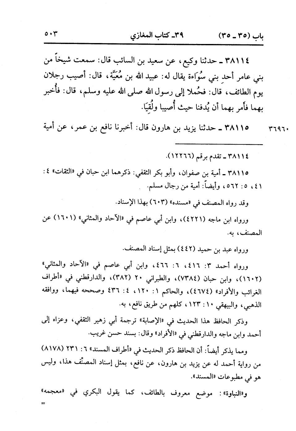 38114- حَدَّثَنَا وَكِيعٌ ، عَنْ سَعِيدِ بْنِ السَّائِبِ ، قَالَ سَمِعْتُ شَيْخًا مِنْ بَنِي عَامِرٍ ، أَحَدِ بَنِي سُوَاءَةَ ، يُقَالُ لَهُ : عُبَيْدُ اللهِ بْنُ مُعَيَّةَ ، قَالَ : أُصِيبَ رَجُلاَنِ يَوْمَ الطَّائِفِ ، قَالَ : فَحُمِلاَ إِلَى رَسُولِ اللهِ صَلَّى الله عَلَيْهِ وَسَلَّمَ ، قَالَ : فَأُخْبِرَ بِهِمَا ، فَأَمَرَ بِهِمَا أَنْ يُدْفَنَا حَيْثُ أُصِيبَا وَلُقِيَا.