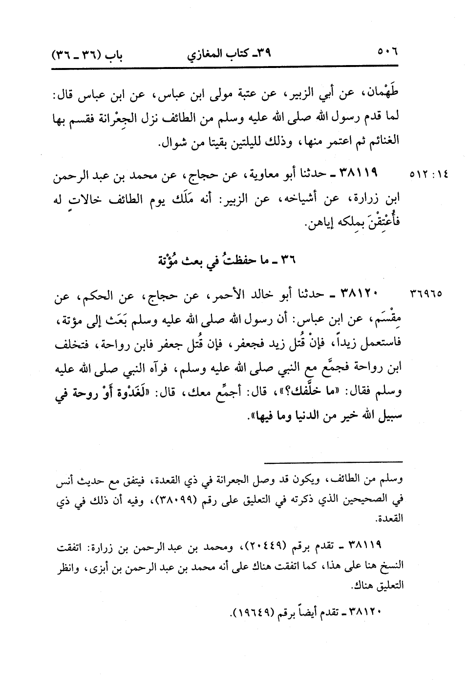 38120- حَدَّثَنَا أَبُو خَالِدٍ الأَحْمَرُ ، عَنْ حَجَّاجٍ ، عَنِ الْحَكَمِ ، عَنْ مِقْسَمٍ ، عَنِ ابْنِ عَبَّاسٍ ؛ أَنَّ رَسُولَ اللهِ صَلَّى الله عَلَيْهِ وَسَلَّمَ بَعَثَ إِلَى مُؤْتَةَ ، فَاسْتَعْمَلَ زَيْدًا ، فَإِنْ قُتِلَ زَيْدٌ فَجَعْفَرٌ ، فَإِنْ قُتِلَ جَعْفَرٌ فَابْنُ رَوَاحَةَ ، فَتَخَلَّفَ ابْنُ رَوَاحَةَ فَجَمَّعَ مَعَ النَّبِيِّ صَلَّى الله عَلَيْهِ وَسَلَّمَ ، فَرَآهُ النَّبِيُّ صَلَّى الله عَلَيْهِ وَسَلَّمَ ، فَقَالَ : مَا خَلَّفَكَ ؟ قَالَ : أُجَمِّعُ مَعَكَ ، قَالَ : لَغَدْوَةٌ ، أَوْ رَوْحَةٌ فِي سَبِيلِ اللهِ خَيْرٌ مِنَ الدُّنْيَا وَمَا فِيهَا. (14/512).
