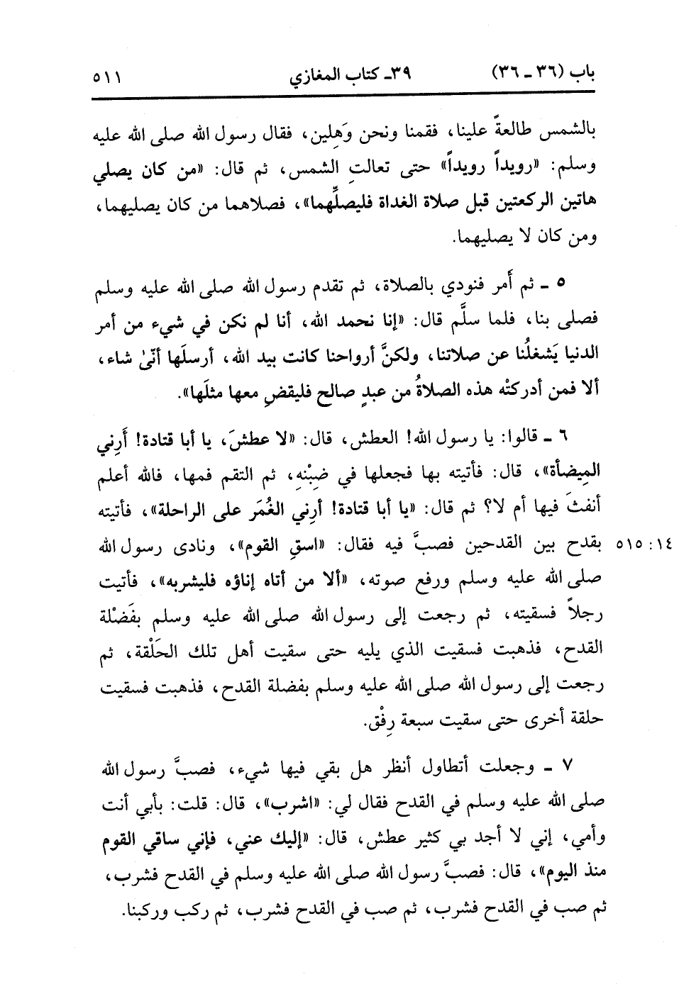 وَنَادَى (14/514) رَسُولُ اللهِ وَرَفَعَ صَوْتَهُ : أَلاَ مَنْ أَتَاهُ إِنَاؤُهُ فَلْيَشْرَبْهُ ، فَأَتَيْتُ رَجُلاً فَسَقَيْتُهُ ، ثُمَّ رَجَعْتُ إِلَى رَسُولِ اللهِ صَلَّى الله عَلَيْهِ وَسَلَّمَ بِفَضْلَةِ الْقَدَحِ ، فَذَهَبْتُ فَسَقَيْتُ الَّذِي يَلِيهِ ، حَتَّى سَقَيْتُ أَهْلَ تِلْكَ الْحَلْقَةِ ، ثُمَّ رَجَعْتُ إِلَى رَسُولِ اللَّه صَلَّى الله عَلَيْهِ وَسَلَّمَ بِفَضْلَةِ الْقَدَحِ ، فَذَهَبْتُ فَسَقَيْتُ حَلْقَةً أُخْرَى ، حَتَّى سَقَيْت سَبْعَةَ رُفَقٍ.