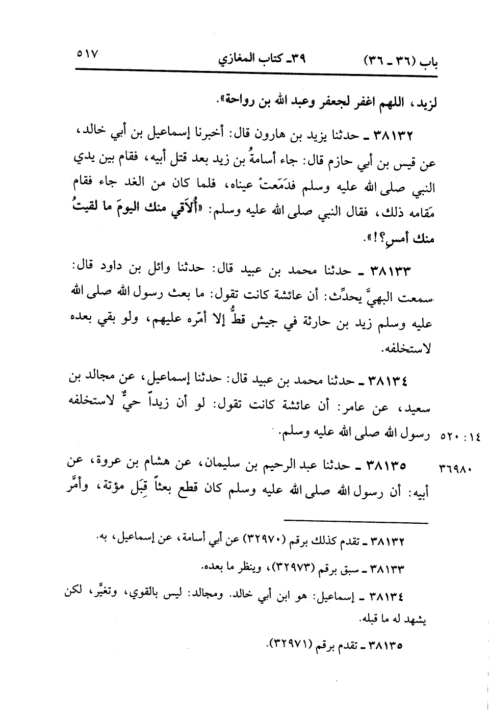 38134- حَدَّثَنَا مُحَمَّدُ بْنُ عُبَيْدٍ , قَالَ : حدَّثَنَا إِسْمَاعِيلُ ، عَنْ مُجَالِدِ بْنِ سَعِيدٍ ، عَنْ عَامِرٍ ، أَنَّ عَائِشَةَ كَانَتْ تَقُولُ : لَوْ أَنَّ زَيْدًا حَيٌّ لاَسْتَخْلَفَهُ رَسُولُ اللهِ صَلَّى الله عَلَيْهِ وَسَلَّمَ. (14/519).