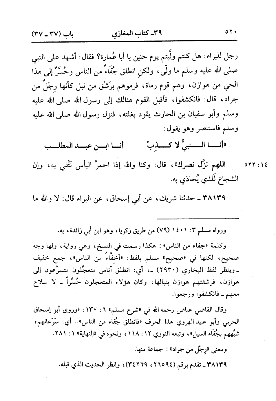 38138- حَدَّثَنَا أَبُو أُسَامَةَ ، عَنْ زَكَرِيَّا ، عَنْ أَبِي إِسْحَاقَ ، قَالَ : قَالَ رَجُلٌ لِلْبَرَاءِ : هَلْ كُنْتُمْ وَلَّيْتُمْ يَوْمَ حُنَيْنٍ ، يَا أَبَا عُمَارَةَ ؟ فَقَالَ : أَشْهَدُ عَلَى النَّبِيِّ صَلَّى الله عَلَيْهِ وَسَلَّمَ مَا وَلَّى ، وَلَكِنَّ انْطَلَقَ جُفَاءٌ مِنَ النَّاسِ وَحُسَّرٌ إلَى هَذَا الْحَيِّ مِنْ هَوَازِنَ ، وَهُمْ قَوْمٌ رُمَاةٌ ، فَرَمَوْهُمْ بِرِشْقٍ مِنْ نَبْلٍ كَأَنَّهَا رِجْلٌ مِنْ جَرَادٍ ، قَالَ : فَانْكَشَفُوا ، فَأَقْبَلَ الْقَوْمُ هُنَالِكَ إِلَى رَسُولِ اللهِ صَلَّى الله عَلَيْهِ وَسَلَّمَ ، وَأَبُو سُفْيَانَ بْنُ الْحَارِثِ يَقُودُ بَغْلَتَهُ ، فَنَزَلَ رَسُولُ اللهِ صَلَّى الله عَلَيْهِ وَسَلَّمَ فَاسْتَنْصَرَ ، وَهُوَ يَقُولُ :