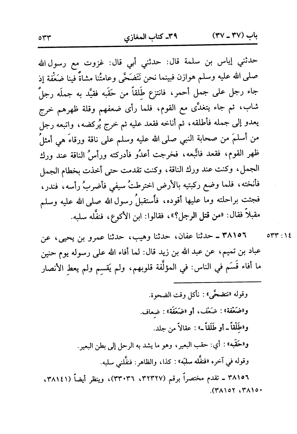 38155- حَدَّثَنَا هَاشِمُ بْنُ الْقَاسِمِ , قَالَ : حدَّثَنَا عِكْرِمَةُ بْنُ عَمَّارٍ ، قَالَ : حَدَّثَنَا إِيَاسُ بْنُ سَلَمَةَ ، قَالَ : حَدَّثَنِي أَبِي ، قَالَ : غَزَوْتُ مَعَ رَسُولِ اللهِ صَلَّى الله عَلَيْهِ وَسَلَّمَ هَوَازِنَ ، فَبَيْنَمَا نَحْنُ نَتَضَحَّى ، وَعَامَّتُنَا مُشَاةٌ ، فِينَا ضَعَفَةٌ ، إِذْ جَاءَ رَجُلٌ عَلَى جَمَلٍ أَحْمَرَ ، فَانْتَزَعَ طَلَقًا مِنْ حَقَبِهِ ، فَقَيَّدَ بِهِ جَمَلَهُ رَجُلٌ شَابٌّ ، ثُمَّ جَاءَ يَتَغَدَّى مَعَ الْقَوْمِ ، فَلَمَّا رَأَى ضَعْفَهُمْ وَقِلَّةَ ظَهْرِهِمْ خَرَجَ يَعْدُو إِلَى جَمَلِهِ فَأَطْلَقَهُ ، ثُمَّ أَنَاخَهُ فَقَعَدَ عَلَيْهِ ، ثُمَّ خَرَجَ يَرْكُضُهُ ، وَاتَّبَعَهُ رَجُلٌ مِنْ أَسْلَمَ مِنْ صَحَابَةِ النَّبِيِّ صَلَّى الله عَلَيْهِ وَسَلَّمَ عَلَى نَاقَةٍ وَرْقَاءَ ، هِيَ أَمْثَلُ ظَهْرِ الْقَوْمِ ، فَقَعَدَ فَاتَّبَعَهُ ، فَخَرَجْتُ أَعْدُو فَأَدْرَكْتُهُ وَرَأْسُ النَّاقَةِ عِنْدَ وَرِكِ الْجَمَلِ ، وَكُنْتُ عِنْدَ وَرِكِ النَّاقَةِ ، وَكُنْتُ تَقَدَّمْتُ حَتَّى أَخَذْتُ بِخِطَامِ الْجَمَلِ ، فَأَنَخْتُهُ ، فَلَمَّا وَضَعَ رُكْبَتَيْهِ بِالأَرْضِ ، اخْتَرَطْتُ سَيْفِي فَأَضْرِبُ رَأْسَهُ ، فَنَدَرَ فَجِئْتُ بِرَاحِلَتِهِ ، وَمَا عَلَيْهَا أَقُودُهُ ، فَأَسْتَقْبِلُ رَسُولَ اللهِ صَلَّى الله عَلَيْهِ وَسَلَّمَ مُقْبِلاً ، فَقَالَ : مَنْ قَتَلَ الرَّجُلَ ؟ فَقَالُوا : ابْنُ الأَكْوَعِ ، فَنَفَلَهُ سَلَبَهُ. (14/532).