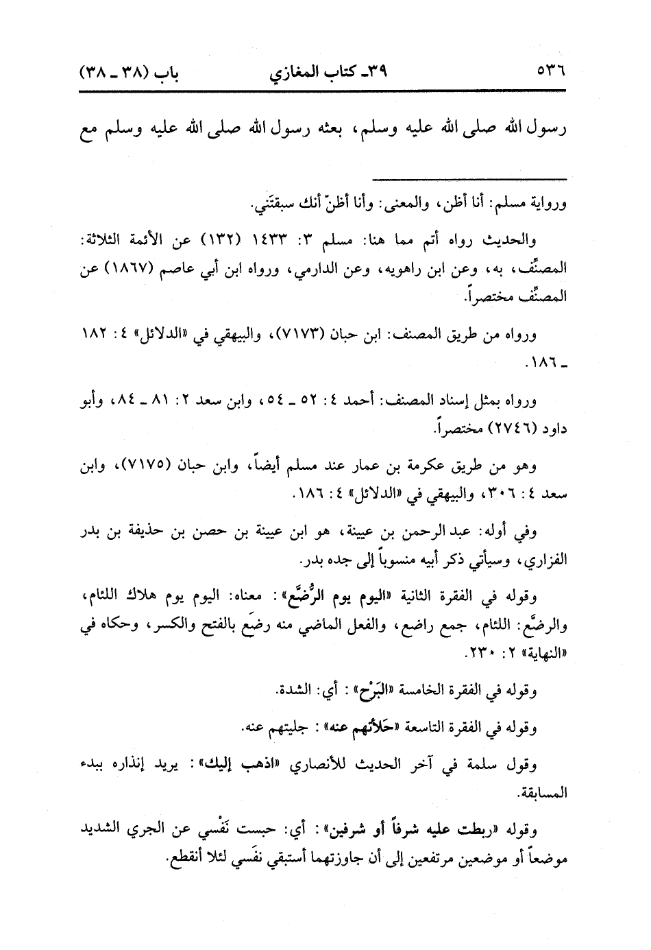 فَأَلْحَقُ بِرَجُلٍ فَأَرْمِيهِ وَهُوَ عَلَى رَحْلِهِ ، فَيَقَعُ سَهْمِي فِي الرَّجُلِ ، حَتَّى انْتَظَمَتْ كَتِفُهُ ، قُلْتُ : خُذْهَا : (14/534)