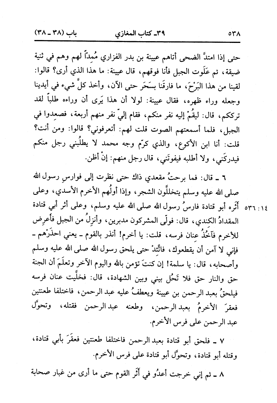 فَقَالَ : يَا ثَكِلَتْنِي أُمِّي ، أَكْوَعِي بُكْرَةَ ، قُلْتُ : نَعَمْ أَيْ عَدُوَّ نَفْسِهِ ، وَكَانَ الَّذِي رَمَيْتُهُ بُكْرَةَ فَأَتْبَعْتُهُ بِسَهْمٍ آخَرَ ، فَعَلَقَ فِيهِ سَهْمَانِ ، وَتَخَلَّفُوا فَرَسَيْنِ ، فَجِئْتُ بِهِمَا أَسُوقُهُمَا إِلَى رَسُولِ اللهِ صَلَّى الله عَلَيْهِ وَسَلَّمَ ، وَهُوَ عَلَى الْمَاءِ الَّذِي حَلأَتْهُمْ عَنْهُ : ذِي قَرَدٍ. (14/536)