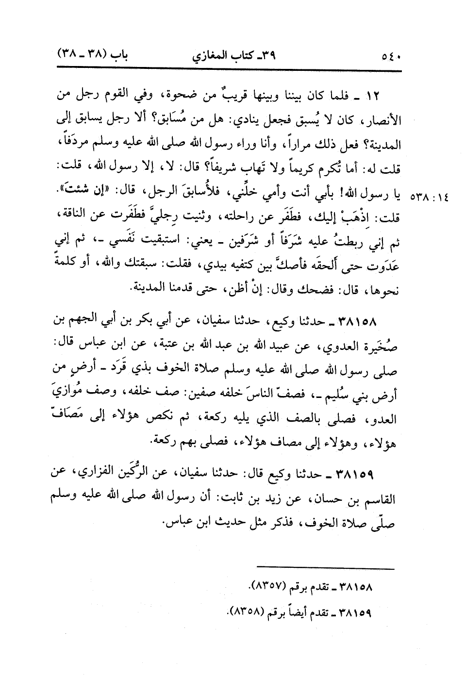 38159- حَدَّثَنَا وَكِيعٌ ، قَالَ : حَدَّثَنَا سُفْيَانُ ، عَنِ الرُّكَيْنِ الْفَزَارِيِّ ، عَنِ الْقَاسِمِ بْنِ حَسَّانَ ، عَنْ زَيْدِ بْنِ ثَابِتٍ ؛ أَنَّ رَسُولَ اللهِ صَلَّى الله عَلَيْهِ وَسَلَّمَ صَلَّى صَلاَةَ الْخَوْفِ ، فَذَكَرَ مِثْلَ حَدِيثِ ابْنِ عَبَّاسٍ. (14/538).