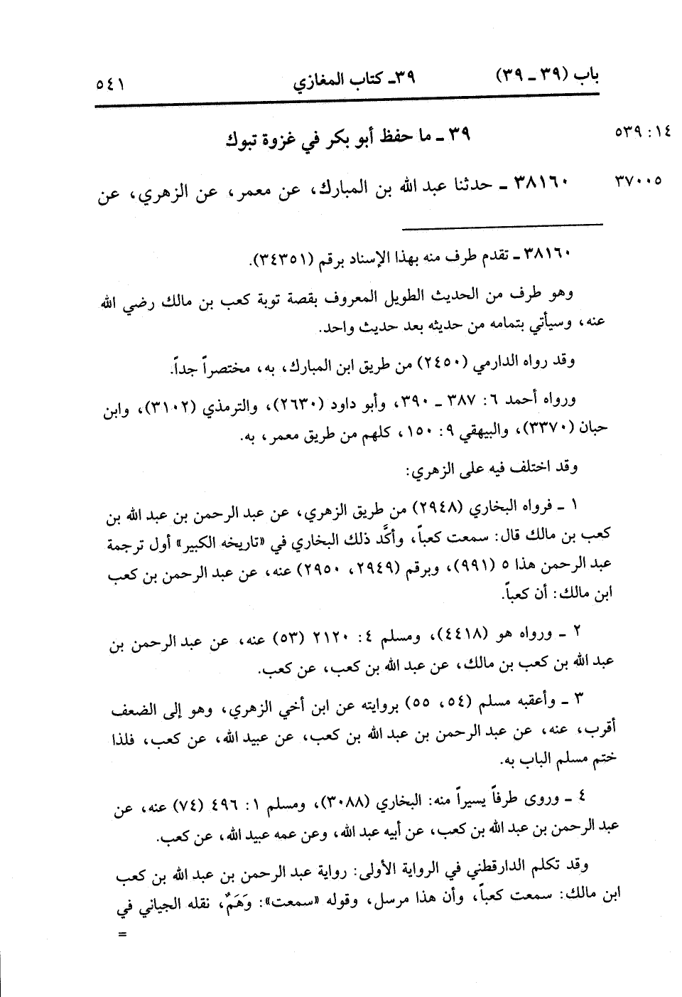 38160- حَدَّثَنَا عَبْدُ اللهِ بْنُ الْمُبَارَكِ ، عَنْ مَعْمَرٍ ، عَنِ الزُّهْرِيِّ ، عَنْ عَبْدِ الرَّحْمَنِ بْنِ كَعْبِ بْنِ مَالِكٍ ، عَنْ أَبِيهِ ، قَالَ : كَانَ رَسُولُ اللهِ صَلَّى الله عَلَيْهِ وَسَلَّمَ إِذَا أَرَادَ غَزْوَةً ، وَرَّى بِغَيْرِهَا حَتَّى كَانَ غَزْوَةُ تَبُوكَ ، سَافَرَ رَسُولُ اللهِ صَلَّى الله عَلَيْهِ وَسَلَّمَ فِي حَرٍّ شَدِيدٍ ، وَاسْتَقْبَلَ سَفَرًا بَعِيدًا ، فَجَلَّى لِلْمُسْلِمِينَ عَنْ أَمْرِهِمْ ، وَأَخْبَرَهُمْ بِذَلِكَ لِيَتَأَهَّبُوا أُهْبَةَ عَدُوِّهِمْ ، وَأَخْبَرَهُمْ بِالْوَجْهِ الَّذِي يُرِيدُ. (14/539).