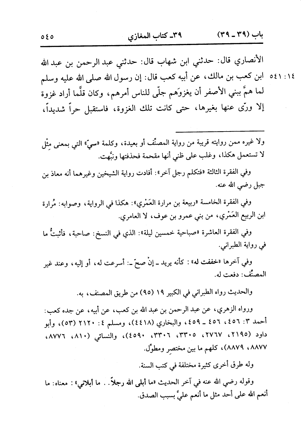 38162- حَدَّثَنَا خَالِدُ بْنُ مَخْلَدٍ ، حَدَّثَنَا عَبْدُ الرَّحْمَنِ بْنُ عَبْدِ الْعَزِيزِ الأَنْصَارِيُّ ، قَالَ : حدَّثَنِي ابْنُ شِهَابٍ ، قَالَ : حَدَّثَنِي عَبْدُ الرَّحْمَنِ بْنُ عَبْدِ اللهِ بْنِ كَعْبِ بْنِ مَالِكٍ ، عَنْ أَبِيهِ كَعْبٍ ، قَالَ : إِنَّ رَسُولَ اللهِ صَلَّى الله عَلَيْهِ وَسَلَّمَ لَمَّا هَمَّ بِبَنِي الأَصْفَرِ أَنْ يَغْزُوَهُمْ ، جَلَّى لِلنَّاسِ أَمْرَهُمْ ، وَكَانَ قَلَّمَا أَرَادَ غَزْوَةً إِلاَّ وَرَّى عنها بِغَيْرِهَا ، حَتَّى كَانَتَ تِلْكَ الْغَزْوَةُ ، فَاسْتَقْبَلَ حَرًّا شَدِيدًا ، وَسَفَرًا بَعِيدًا ، وَعَدُوًّا جَدِيدًا ، فَكَشَفَ لِلنَّاسِ الْوَجْهَ الَّذِي خَرَجَ بِهِمْ إِلَيْهِ ، لِيَتَأَهَّبُوا أُهْبَةَ عَدُوِّهِمْ.