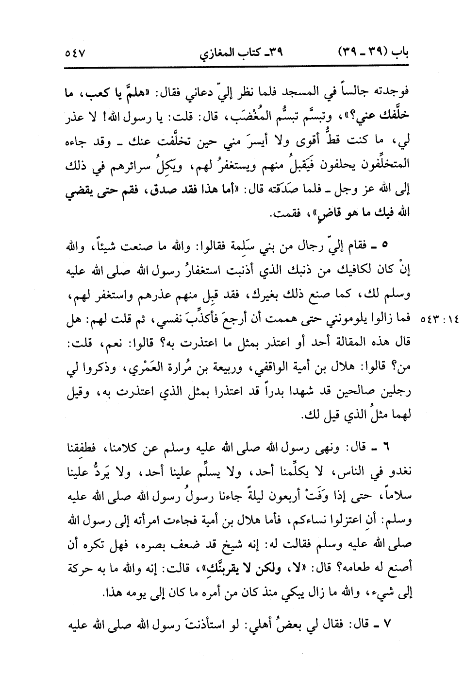 قَالَ : وَنَهَى رَسُولُ اللهِ صَلَّى الله عَلَيْهِ وَسَلَّمَ عَنْ كَلاَمُنَا ، فَطَفِقْنَا نَغْدُو فِي النَّاسِ ، لاَ يُكَلِّمُنَا أَحَدٌ ، وَلاَ يُسَلِّمُ عَلَيْنَا أَحَدٌ ، وَلاَ يَرُدُّ عَلَيْنَا سَلاَمًا ، حَتَّى إِذَا وفَتْ أَرْبَعُونَ لَيْلَةً ، جَاءَنَا رَسُولُ رَسُولِ اللهِ صَلَّى الله عَلَيْهِ وَسَلَّمَ أَنِ اعْتَزِلُوا نِسَاءَكُمْ ، فَأَمَّا هِلاَلُ بْنُ أُمَيَّةَ ، فَجَاءَتِ امْرَأَتُهُ إِلَى رَسُولِ اللهِ صَلَّى الله عَلَيْهِ وَسَلَّمَ ، فَقَالَتْ لَهُ : إِنَّهُ شَيْخٌ قَدْ ضَعُفَ بَصَرُهُ ، فَهَلْ تَكْرَهُ أَنْ أَصْنَعَ لَهُ طَعَامَهُ ؟ قَالَ : لاَ ، وَلَكِنْ لاَ يَقْرَبَنَّكِ ، قَالَتْ : إِنَّهُ وَاللهِ مَا بِهِ حَرَكَةٌ إِلَى شَيْءٍ ، وَاللهِ مَا زَالَ يَبْكِي مُنْذُ كَانَ مِنْ أَمْرِهِ مَا كَانَ إِلَى يَوْمِهِ هَذَا ، قَالَ : فَقَالَ لِي بَعْضُ أَهْلِي : لَوِ اسْتَأْذَنْتَ رَسُولَ اللهِ صَلَّى الله عَلَيْهِ وَسَلَّمَ فِي امْرَأَتِكَ ، كَمَا اسْتَأْذَنَتِ امْرَأَةُ هِلاَلِ بْنِ أُمَيَّةَ ، فَقَدْ أَذِنَ لَهَا أَنْ تَخْدِمَهُ ، قَالَ : فَقُلْتُ : وَاللهِ ، لاَ أَسْتَأْذِنُهُ فِيهَا ، وَمَا أَدْرِي مَا يَقُولُ رَسُولُ اللهِ صَلَّى الله عَلَيْهِ وَسَلَّمَ إِنَ اسْتَأْذَنْتُهُ ، وَهُوَ شَيْخٌ كَبِيرٌ ، وَأَنَا رَجُلٌ شَابٌ ، فَقُلْتُ لاِمْرَأَتِي : اِلْحَقِي بِأَهْلِكَ ، حَتَّى يَقْضِيَ اللَّهُ مَا هُوَ قَاضٍ ، وَطَفِقْنَا نَمْشِي فِي النَّاسِ ، وَلاَ يُكَلِّمُنَا أَحَدٌ ، وَلاَ يَرُدُّ عَلَيْنَا سَلاَمًا. (14/543).