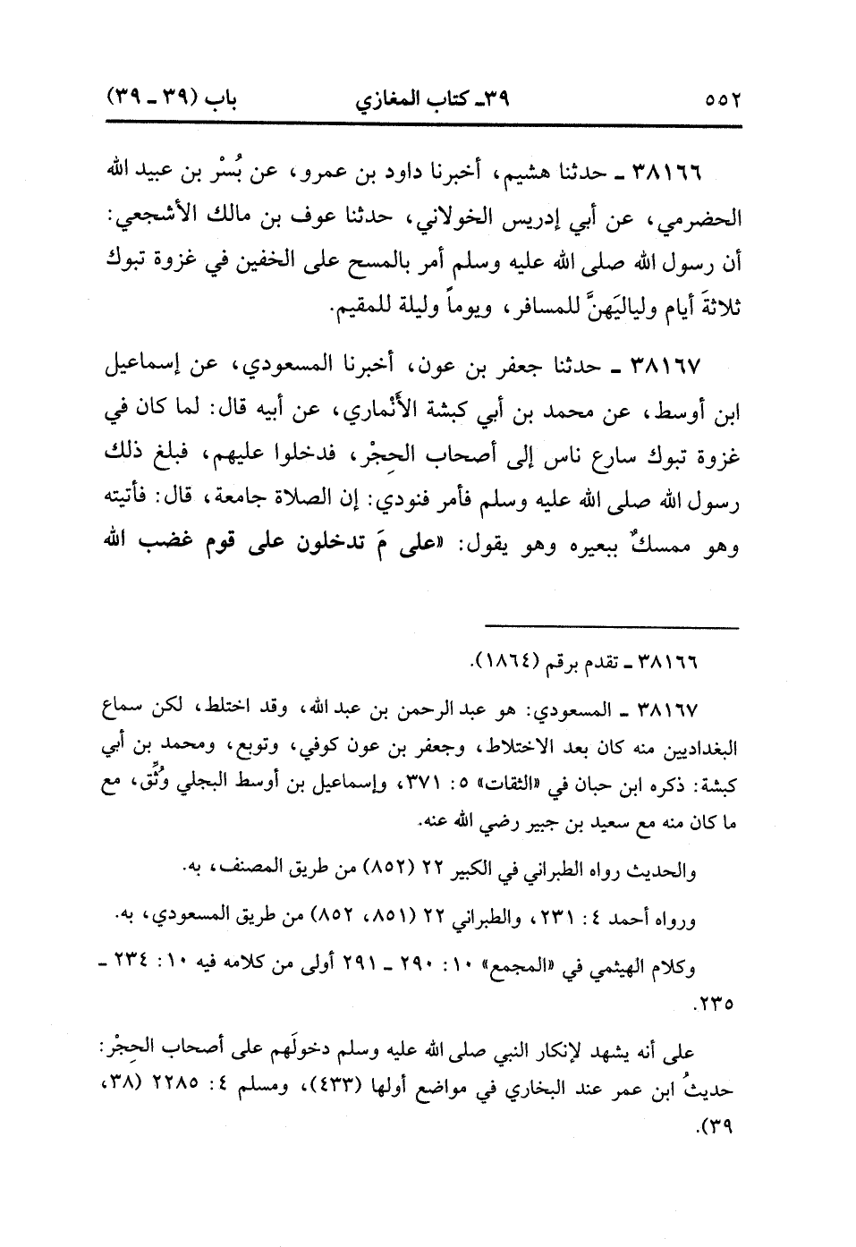 38166- حَدَّثَنَا هُشَيْمٌ ، أَخْبَرَنَا دَاوُد بْنُ عَمْرٍو ، عَنْ بُسْرِ بْنِ عُبَيْدِ اللهِ الْحَضْرَمِيِّ ، عَنْ أَبِي إِدْرِيسَ الْخَوْلاَنِيِّ ، حَدَّثَنَا عَوْفُ بْنُ مَالِكٍ الأَشْجَعِيِّ ؛ أَنَّ رَسُولَ اللهِ صَلَّى الله عَلَيْهِ وَسَلَّمَ أَمَرَ بِالْمَسْحِ عَلَى الْخُفَّيْنِ فِي غَزْوَةِ تَبُوكَ ، ثَلاَثَةَ أَيَّامٍ وَلَيَالِيَهُنَّ لِلْمُسَافِرِ ، وَيَوْمًا وَلَيْلَةً لِلْمُقِيمِ. (14/546).