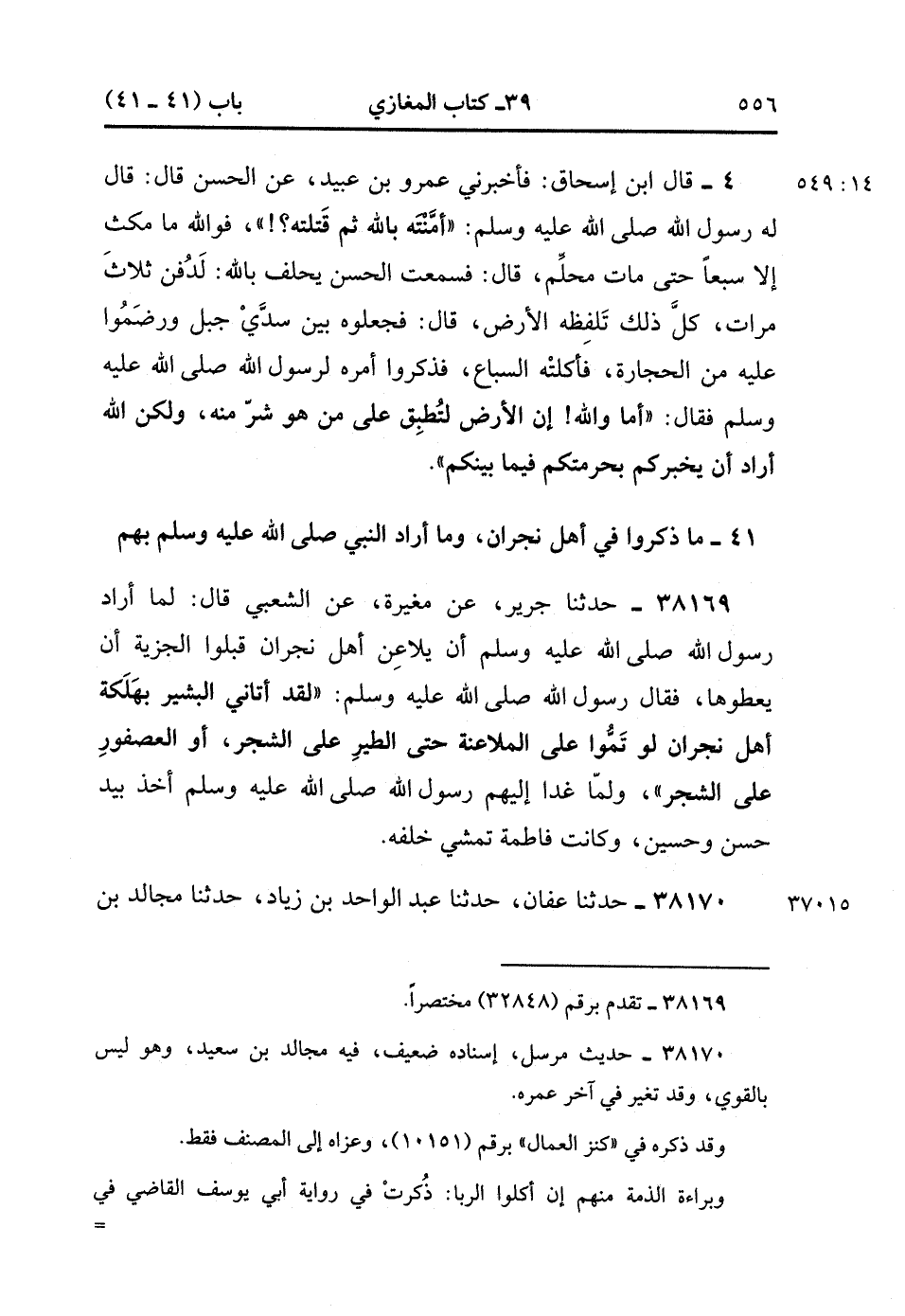 38169- حَدَّثَنَا جَرِيرٌ ، عَنْ مُغِيرَةَ ، عَنِ الشَّعْبِيِّ ، قَالَ : لَمَّا أَرَادَ رَسُولُ اللهِ صَلَّى الله عَلَيْهِ وَسَلَّمَ أَنْ يُلاَعَنْ أَهْلَ نَجْرَانَ قَبِلُوا الْجِزْيَةَ أَنْ يُعْطُوهَا ، فَقَالَ رَسُولُ اللهِ صَلَّى الله عَلَيْهِ وَسَلَّمَ : لَقَدْ أَتَانِي الْبَشِيرُ بِهَلَكَةِ أَهْلِ نَجْرَانَ ، لَوْ تَمُّوا عَلَى الْمُلاَعَنْة ، حَتَّى الطَّيْرِ عَلَى الشَّجَرِ ، أَوِ الْعُصْفُورِ عَلَى الشَّجَرِ ، وَلَمَّا غَدَا إِلَيْهِمْ رَسُولُ اللهِ صَلَّى الله عَلَيْهِ وَسَلَّمَ أَخَذَ بِيَدِ حَسَنٍ وَحُسَيْنٍ ، وَكَانَتْ فَاطِمَةُ تَمْشِي خَلْفَهُ. (14/549).