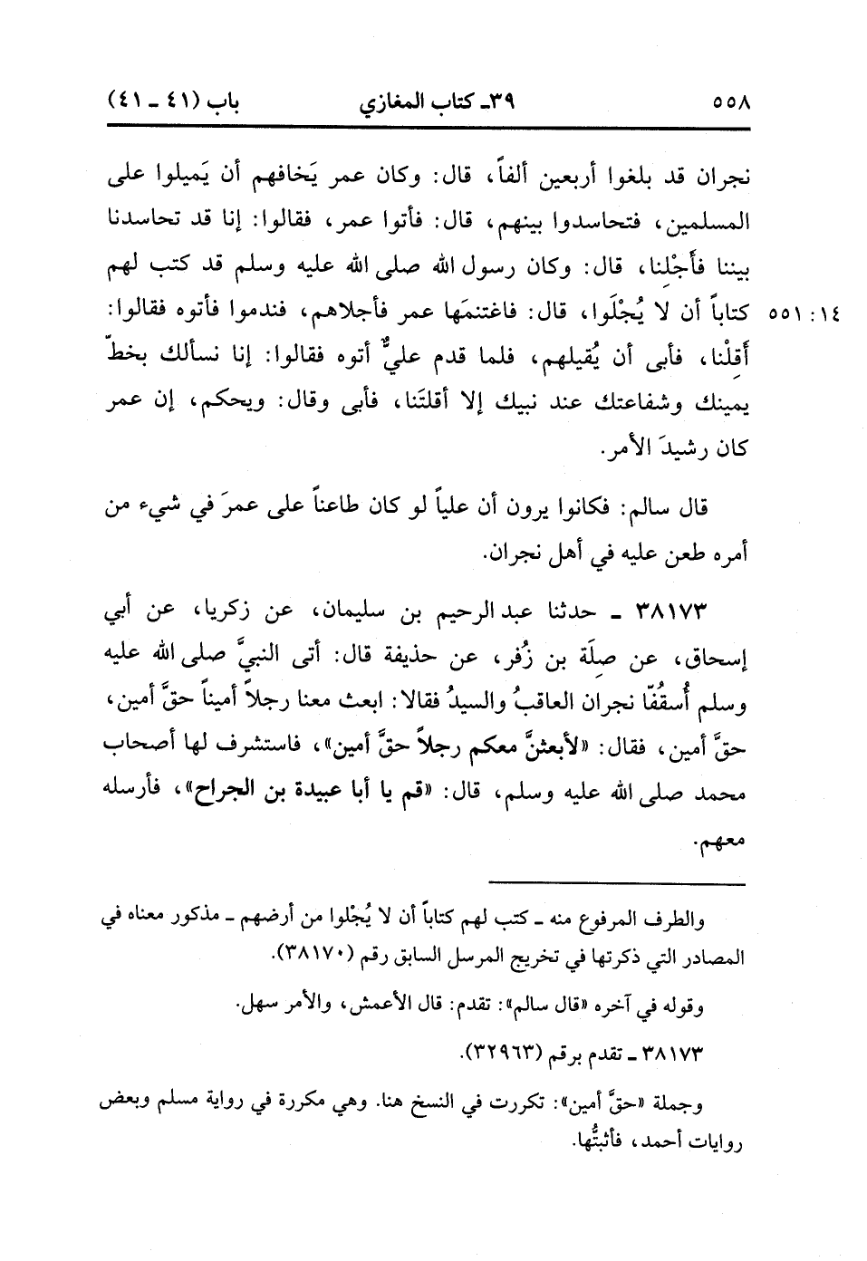 38173- حَدَّثَنَا عَبْدُ الرَّحِيمِ بْنُ سُلَيْمَانَ ، عَنْ زَكَرِيَّا ، عَنْ أَبِي إِسْحَاقَ ، عَنْ صِلَةَ بْنِ زُفَرَ ، عَنْ حُذَيْفَةَ ، قَالَ : أَتَى النَّبِيَّ صَلَّى الله عَلَيْهِ وَسَلَّمَ أُسْقُفَا نَجْرَانَ ؛ الْعَاقِبُ وَالسَّيِّدُ ، فَقَالاَ : ابْعَثْ مَعَنا رَجُلاً أَمِينًا ، حَقَّ أَمِينٍ ، حَقَّ أَمِينٍ ، فَقَالَ : لأَبْعَثَنَّ مَعَكُمْ رَجُلاً حَقَّ أَمِينٍ ، فَاسْتَشْرَفَ لَهَا أَصْحَابُ مُحَمَّدٍ صَلَّى الله عَلَيْهِ وَسَلَّمَ ، قَالَ : قُمْ يَا أَبَا عُبَيْدَةَ بْنَ الْجَرَّاحِ ، فَأَرْسَلَهُ مَعَهُمْ. (14/551).