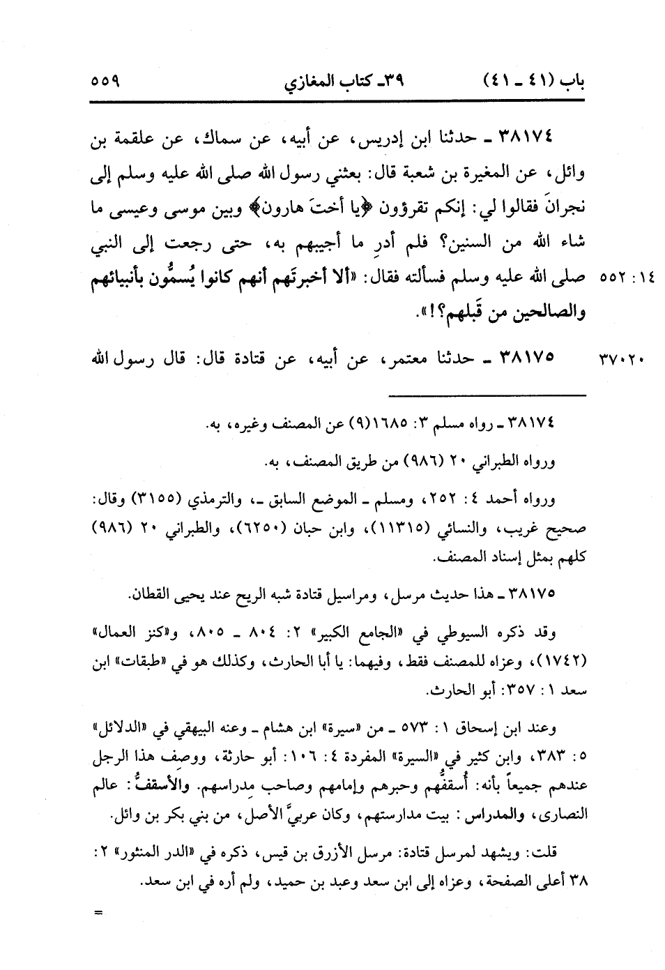 38174- حَدَّثَنَا ابْنُ إِدْرِيسَ ، عَنْ أَبِيهِ ، عَنْ سِمَاكٍ ، عَنْ عَلْقَمَةَ بْنِ وَائِلٍ ، عَنِ الْمُغِيرَةَ بْنِ شُعْبَةَ ، قَالَ : بَعَثَنِي رَسُولُ اللهِ صَلَّى الله عَلَيْهِ وَسَلَّمَ إِلَى نَجْرَانَ ، فَقَالُوا لِي : إِنَّكُمْ تَقْرَؤُونَ : {يَا أُخْتَ هَارُونَ} وَبَيْنَ مُوسَى وَعِيسَى مَا شَاءَ اللَّهُ مِنَ السِّنِينَ ؟ فَلَمْ أَدْرِ مَا أُجِيبُهُمْ بِهِ ، حَتَّى رَجَعْتُ إِلَى النَّبِيُّ صَلَّى الله عَلَيْهِ وَسَلَّمَ فَسَأَلْتُهُ ، فَقَالَ : أَلاَ أَخْبَرْتَهُمْ أَنَّهُمْ كَانُوا يُسَمَّونَ بِأَنْبِيَائِهِمْ ، وَالصَّالِحِينَ مِنْ قَبْلِهِمْ ؟. (14/551).