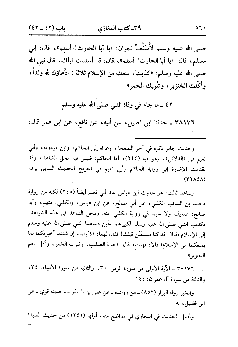 38175- حَدَّثَنَا مُعْتَمِرٌ ، عَنْ أَبِيهِ ، عَنْ قَتَادَةَ ، قَالَ : قَالَ رَسُولُ اللهِ صَلَّى الله عَلَيْهِ وَسَلَّمَ لأَسْقُفِ نَجْرَانَ : يَا أَبَا الْحَارِثِ ، أَسْلِمْ ، قَالَ : إِنِّي مُسْلِمٌ ، قَالَ : يَا أَبَا الْحَارِثِ ، أَسْلِمْ ، قَالَ : قَدْ أَسْلَمْتُ قَبْلَك ، قَالَ نَبِيُّ اللهِ صَلَّى الله عَلَيْهِ وَسَلَّمَ : كَذَبْتَ ، مَنَعَك مِنَ الإِسْلاَمِ ثَلاَثَةٌ : ادِّعَاؤُك لِلَّهِ وَلَدًا ، وَأَكْلُك الْخِنْزِيرَ ، وَشُرْبُك الْخَمْرَ. (14/552).