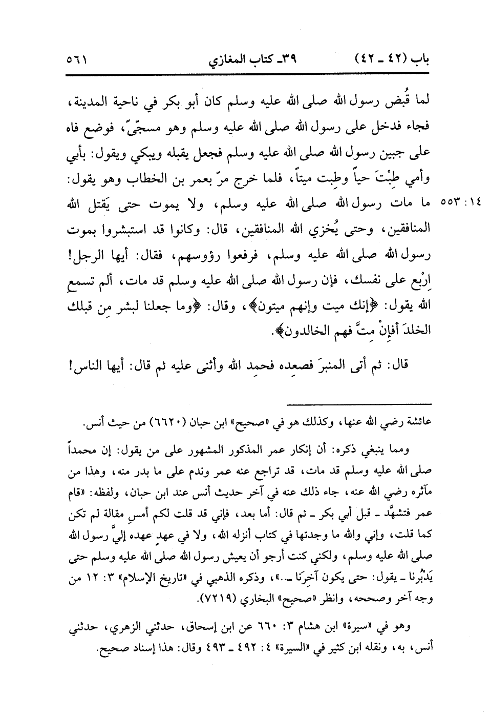 38176- حَدَّثَنَا ابْنُ فُضَيْلٍ ، عَنْ أَبِيهِ ، عَنْ نَافِعٍ ، عَنِ ابْنِ عُمَرَ ، قَالَ : لَمَّا قُبِضَ رَسُولُ اللهِ صَلَّى الله عَلَيْهِ وَسَلَّمَ ، كَانَ أَبُو بَكْرٍ فِي نَاحِيَةِ الْمَدِينَةِ ، فَجَاءَ فَدَخَلَ عَلَى رَسُولِ اللهِ صَلَّى الله عَلَيْهِ وَسَلَّمَ وَهُوَ مُسَجًّى ، فَوَضْعَ فَاهُ عَلَى جَبِينِ رَسُولِ اللهِ صَلَّى الله عَلَيْهِ وَسَلَّمَ ، فَجَعَلَ يُقَبِّلُهُ وَيَبْكِي وَيَقُولُ : بِأَبِي وَأُمِّي ، طِبْتَ حَيًّا ، وَطِبْتَ مَيِّتًا ، فَلَمَّا خَرَجَ مَرَّ بِعُمَرَ بْنِ الْخَطَّابِ وَهُوَ يَقُولُ : مَا مَاتَ رَسُولُ اللهِ صَلَّى الله عَلَيْهِ وَسَلَّمَ ، وَلاَ يَمُوتُ حَتَّى يَقْتُلَ اللَّهُ الْمُنَافِقِينَ ، وَحَتَّى يُخْزِيَ اللَّهُ الْمُنَافِقِينَ ، قَالَ : وَكَانُوا قَدَ اسْتَبْشَرُوا بِمَوْتِ رَسُولِ اللهِ صَلَّى الله عَلَيْهِ وَسَلَّمَ فَرَفَعُوا رُؤُوسَهُمْ ، فَقَالَ : أَيُّهَا الرَّجُلُ ، اِرْبَعْ عَلَى نَفْسِكَ ، فَإِنَّ رَسُولَ اللهِ قَدْ مَاتَ ، أَلَمْ تَسْمَعَ اللَّهَ يَقُولُ : {إِنَّك مَيِّتٌ وَإِنَّهُمْ مَيِّتُونَ} وَقَالَ : {وَمَا جَعَلْنَا لِبَشَرٍ مِنْ قَبْلِكَ الْخُلْدَ أَفَإِنْ مِتَّ فَهُمَ الْخَالِدُونَ}.(14/553).
