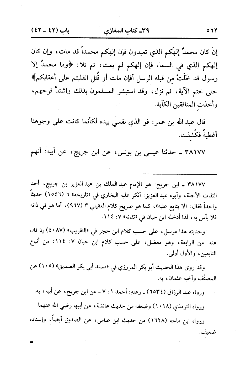 قَالَ : ثُمَّ أَتَى الْمِنْبَرَ فَصَعِدَهُ ، فَحَمِدَ اللَّهَ وَأَثْنَى عَلَيْهِ ، ثُمَّ قَالَ : أَيُّهَا النَّاسُ ، إِنْ كَانَ مُحَمَّدٌ إِلَهَكُمُ الَّذِي تَعْبُدُونَ ، فَإِنَّ إلَهَكُمْ مُحَمَّدًا قَدْ مَاتَ ، وَإِنْ كَانَ إِلَهَكُمُ الَّذِي فِي السَّمَاءِ ، فَإِنَّ إِلَهَكُمْ لَمْ يَمُتْ ، ثُمَّ تَلاَ : {وَمَا مُحَمَّدٌ إِلاَّ رَسُولٌ قَدْ خَلَتْ مِنْ قَبْلِهِ الرُّسُلُ ، أَفَإِنْ مَاتَ ، أَوْ قُتِلَ انْقَلَبْتُمْ عَلَى أَعْقَابِكُمْ} حَتَّى خَتَمَ الآيَةَ ، ثُمَّ نَزَلَ ، وَقَدِ اسْتَبْشَرَ الْمُسْلِمُونَ بِذَلِكَ وَاشْتَدَّ فَرَحُهُمْ ، وَأَخَذَتِ الْمُنَافِقِينَ الْكَآبَةُ.
