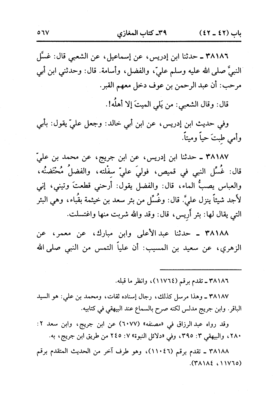 38186- حَدَّثَنَا ابْنُ إِدْرِيسَ ، عَنْ إِسْمَاعِيلَ ، عَنِ الشَّعْبِيِّ ، قَالَ : غَسَّلَ النَّبِيَّ صَلَّى الله عَلَيْهِ وَسَلَّمَ عَلِيٌّ ، وَالْفَضْلُ ، وَأُسَامَةُ.