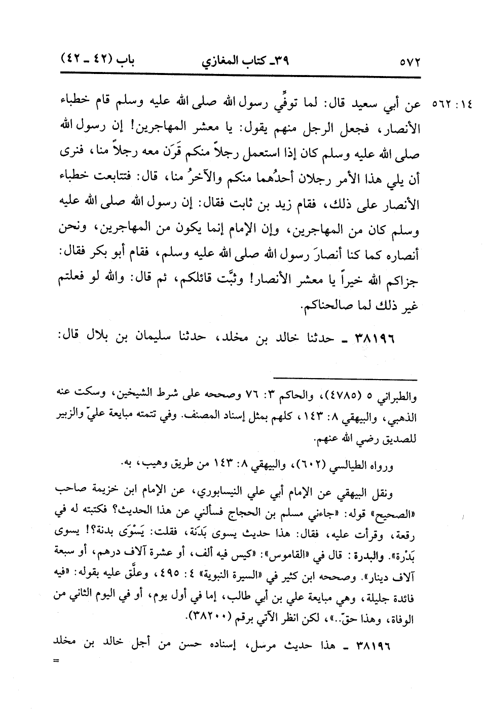 38195- حَدَّثَنَا عَفَّانُ ، حَدَّثَنَا وُهَيْبٌ ، حَدَّثَنَا دَاوُد ، عَنْ أَبِي نَضْرَةَ ، عَنْ أَبِي سَعِيدٍ ، قَالَ : لَمَّا تُوُفِّيَ رَسُولُ اللهِ صَلَّى الله عَلَيْهِ وَسَلَّمَ قَامَ خُطَبَاءُ الأَنْصَارِ ، فَجَعَلَ الرَّجُلُ مِنْهُمْ يَقُولُ : يَا مَعْشَرَ الْمُهَاجِرِينَ ، إِنَّ رَسُولَ اللهِ صَلَّى الله عَلَيْهِ وَسَلَّمَ كَانَ إِذَا اسْتَعْمَلَ رَجُلاً مِنْكُمْ ، قَرَنَ مَعَهُ رَجُلاً مِنَّا ، فَنَرَى أَنْ يَلِيَ هَذَا الأَمْرَ رَجُلاَنِ ؛ أَحَدُهُمَا مِنْكُمْ وَالآخَرُ مِنَّا ، قَالَ : فَتَتَابَعَتْ خُطَبَاءُ الأَنْصَارِ عَلَى ذَلِكَ ، فَقَامَ زَيْدُ بْنُ ثَابِتٍ ، فَقَالَ : إِنَّ رَسُولَ اللهِ صَلَّى الله عَلَيْهِ وَسَلَّمَ كَانَ مِنَ الْمُهَاجِرِينَ ، وَإِنَّ الإِمَامَ إِنَّمَا يَكُونُ مِنَ الْمُهَاجِرِينَ ، وَنَحْنُ أَنْصَارُهُ كَمَا كُنَّا أَنْصَارَ رَسُولِ اللهِ ، فَقَامَ أَبُو بَكْرٍ ، فَقَالَ : جَزَاكُمُ اللَّهُ خَيْرًا ، يَا مَعْشَرَ الأَنْصَارِ ، وَثَبَّتَ قَائِلَكُمْ ، ثُمَّ قَالَ : وَاللهِ لَوْ فَعَلْتُمْ غَيْرَ ذَلِكَ ، لَمَا صَالَحْنَاكُمْ. (14/562).