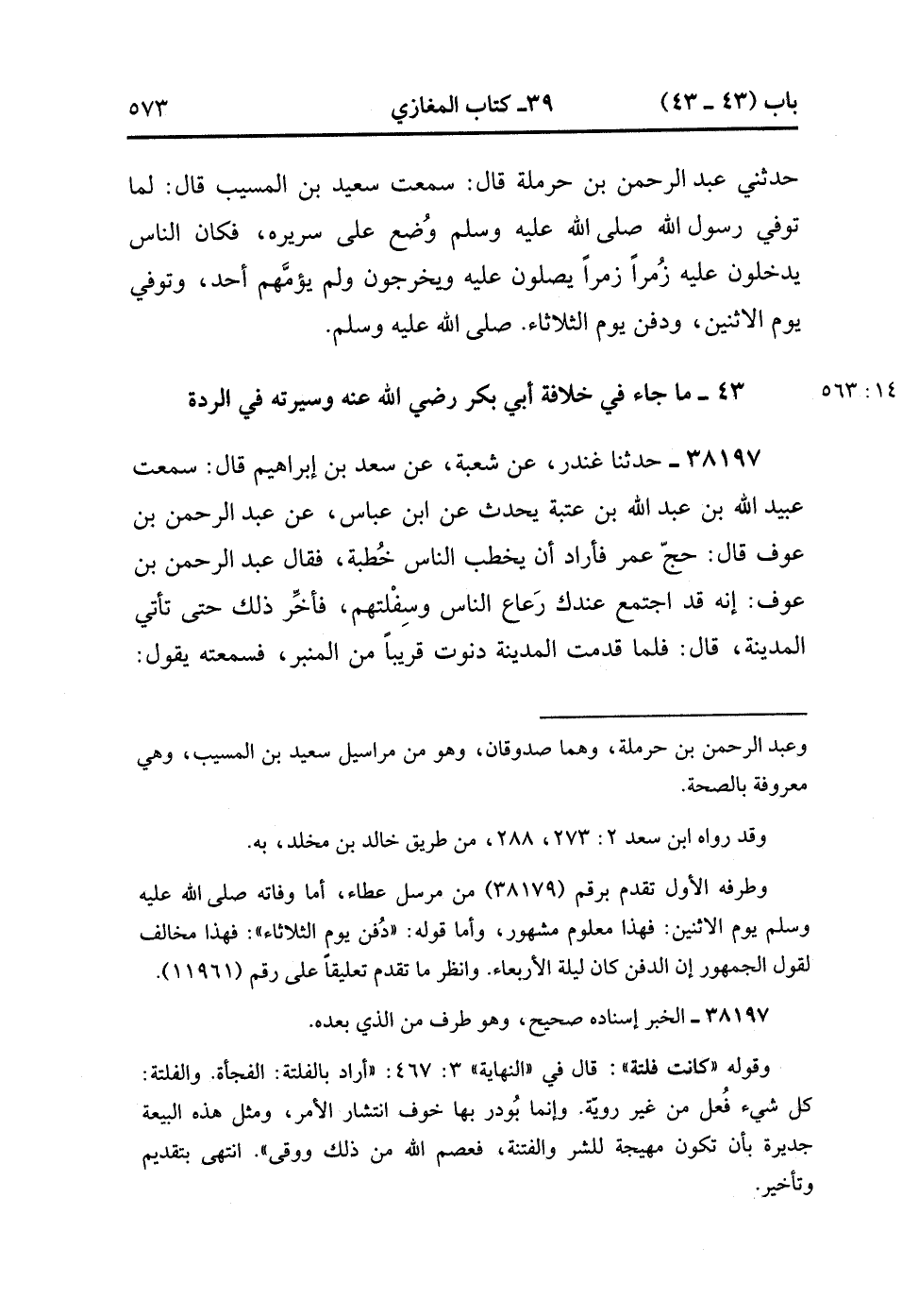 38196- حَدَّثَنَا خَالِدُ بْنُ مَخْلَدٍ ، حَدَّثَنَا سُلَيْمَانُ بْنُ بِلاَلٍ ، قَالَ : حدَّثَنِي عَبْدُ الرَّحْمَنِ بْنُ حَرْمَلَةَ ، قَالَ : سَمِعْتُ سَعِيدَ بْنَ الْمُسَيَّبِ ، قَالَ : لَمَّا تُوُفِّيَ رَسُولُ اللهِ صَلَّى الله عَلَيْهِ وَسَلَّمَ وُضِعَ عَلَى سَرِيرِهِ ، فَكَانَ النَّاسُ يَدْخُلُونَ عَلَيْهِ زُمَرًا زُمَرًا ، يُصَلُّونَ عَلَيْهِ وَيَخْرُجُونَ ، وَلَمْ يَؤُمَّهُمْ أَحَد ، وَتُوُفِّيَ يَوْمَ الاِثْنَيْنِ ، وَدُفِنَ يَوْمَ الثُّلاَثَاءِ صَلَّى الله عَلَيْهِ وَسَلَّمَ . (14/562).