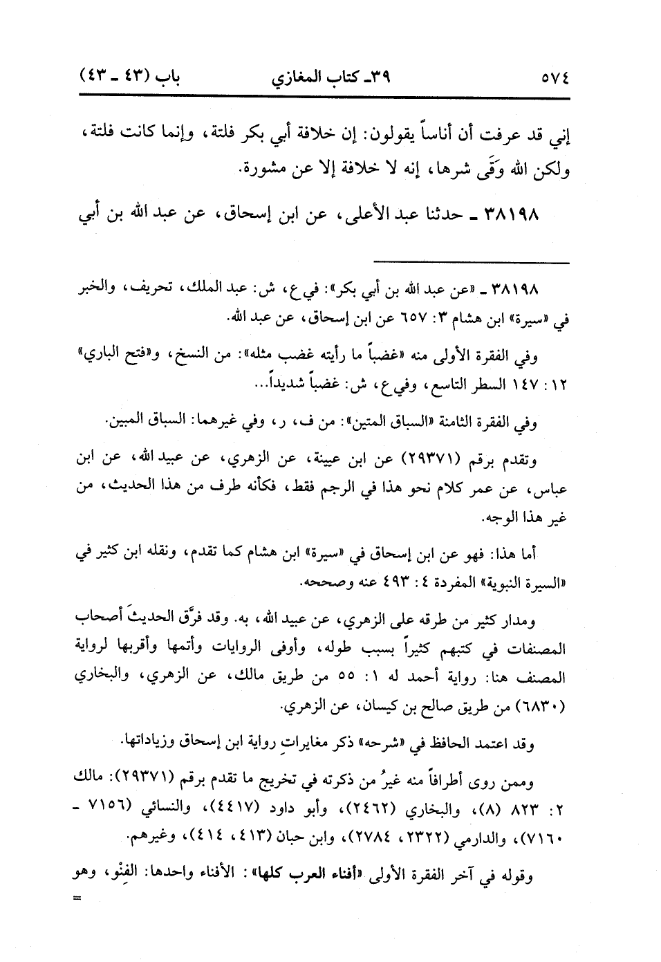 38197- حَدَّثَنَا غُنْدَرٌ ، عَنْ شُعْبَةَ ، عَنْ سَعْدِ بْنِ إبْرَاهِيمَ ، قَالَ : سَمِعْتُ عُبَيْدَ اللهِ بْنَ عَبْدِ اللهِ بْنِ عُتْبَةَ يُحَدِّثُ ، عَنِ ابْنِ عَبَّاسٍ ، عَنْ عَبْدِ الرَّحْمَنِ بْنِ عَوْفٍ ، قَالَ : حَجَّ عُمَرُ فَأَرَادَ أَنْ يَخْطُبَ النَّاسَ خُطْبَةً ، فَقَالَ عَبْدُ الرَّحْمَنِ بْنُ عَوْفٍ : إِنَّهُ قَدَ اجْتَمَعَ عِنْدَكَ رِعَاعُ النَّاسِ وَسِفْلَتُهُمْ ، فَأَخِّرْ ذَلِكَ حَتَّى تَأْتِيَ الْمَدِينَةَ ، قَالَ : فَلَمَّا قَدِمْتُ الْمَدِينَةَ دَنَوْتُ قَرِيبًا مِنَ الْمِنْبَرِ ، فَسَمِعْتُهُ يَقُولُ : إِنِّي قَدْ عَرَفْتُ ، أَنَّ أُنَاسًا يَقُولُونَ : إِنَّ خِلاَفَةَ أَبِي بَكْرٍ فَلْتَةٌ ، وَإِنَّمَا كَانَتْ فَلْتَةً ، وَلَكِنَّ اللَّهَ وَقَى شَرَّهَا ، إِنَّهُ لاَ خِلاَفَةَ إِلاَ عَنْ مَشُورَةٍ. (14/563).