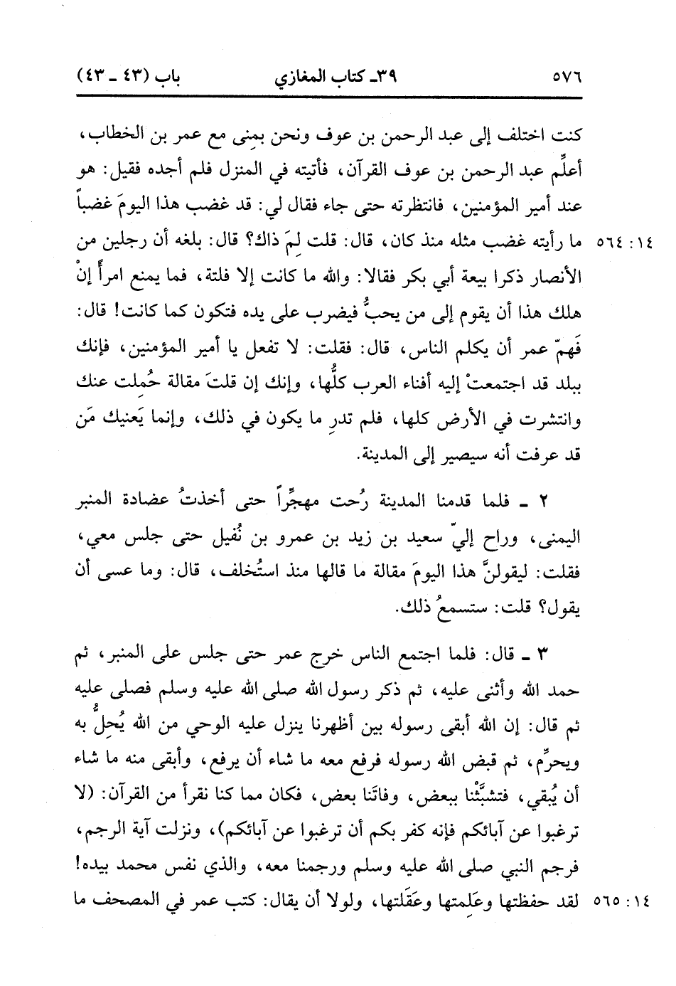 قَالَ : فَلَمَّا اجْتَمَعَ النَّاسُ خَرَجَ عُمَرُ حَتَّى جَلَسَ عَلَى الْمِنْبَرِ ، ثُمَّ حَمِدَ اللَّهَ وَأَثْنَى عَلَيْهِ ، ثُمَّ ذَكَرَ رَسُولَ اللهِ صَلَّى الله عَلَيْهِ وَسَلَّمَ ، فَصَلَّى عَلَيْهِ ، ثُمَّ قَالَ : إِنَّ اللَّهَ أَبْقَى رَسُولَهُ بَيْنَ أَظْهُرِنَا ، يَنْزِلُ عَلَيْهِ الْوَحْيُ مِنَ اللهِ ، يُحِلُّ بِهِ وَيُحَرِّمُ ، ثُمَّ قَبَضَ اللَّهُ رَسُولَهُ ، فَرَفَعَ مِنْهُ مَا شَاءَ أَنْ يَرْفَعَ ، وَأَبْقَى مِنْهُ مَا شَاءَ أَنْ يُبْقِي ، فَتَشَبَّثْنَا بِبَعْضٍ ، وَفَاتَنَا بَعْضٌ ، فَكَانَ مِمَّا كُنَّا نَقْرَأُ مِنَ الْقُرْآنِ : لاَ تَرْغَبُوا عَنْ آبَائِكُمْ ، فَإِنَّهُ كُفْرٌ بِكُمْ أَنْ تَرْغَبُوا عَنْ آبَائِكُمْ ، وَنَزَلَتْ آيَةُ الرَّجْمِ ، فَرَجَمَ النَّبِيُّ صَلَّى الله عَلَيْهِ وَسَلَّمَ وَرَجَمْنَا مَعَهُ ، وَالَّذِي نَفْسُ مُحَمَّدٍ بِيَدِهِ ، لَقَدْ حَفِظْتُهَا وَعَلِمْتُهَا وَعَقَلْتهَا ، وَلَوْلاَ أَنْ يُقَالُ : كَتَبَ (14/564) عُمَرُ فِي الْمُصْحَفِ مَا لَيْسَ فِيهِ ، لَكَتَبْتهَا بِيَدِي كِتَابًا ، وَالرَّجْمُ عَلَى ثَلاَثَةِ مَنَازِلَ : حَمْلٌ بَيِّنٌ ، أَوِ اعْتِرَافٌ مِنْ صَاحِبِهِ ، أَوْ شُهُودث عَدْلٌ ، كَمَا أَمَرَ اللَّهُ.