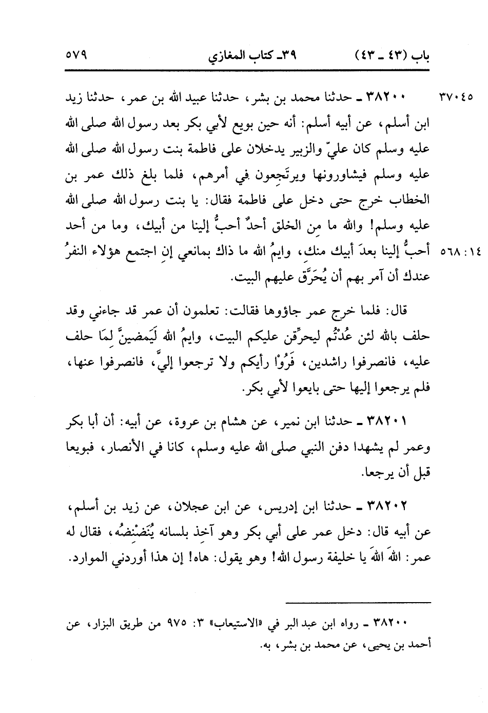 38200- حَدَّثَنَا مُحَمَّدُ بْنُ بِشْرٍ ، حَدَّثَنَا عُبَيْدُ اللهِ بْنُ عُمَرَ ، حَدَّثَنَا زَيْدُ بْنُ أَسْلَمَ ، عْن أَبِيهِ أَسْلَمَ ؛ أَنَّهُ حِينَ بُويِعَ لأَبِي بَكْرٍ بَعْدَ رَسُولِ اللهِ صَلَّى الله عَلَيْهِ وَسَلَّمَ ، كَانَ عَلِيٌّ وَالزُّبَيْرُ يَدْخُلاَنِ عَلَى فَاطِمَةَ بِنْتِ رَسُولِ اللهِ صَلَّى الله عَلَيْهِ وَسَلَّمَ ، فَيُشَاوِرُونَهَا وَيَرْتَجِعُونَ فِي أَمْرِهِمْ ، فَلَمَّا بَلَغَ ذَلِكَ عُمَرَ بْنَ الْخَطَّابِ خَرَجَ حَتَّى دَخَلَ عَلَى فَاطِمَةَ ، فَقَالَ : يَا بِنْتَ رَسُولِ اللهِ صَلَّى الله عَلَيْهِ وَسَلَّمَ ، وَاللهِ مَا مِنْ الْخَلْقِ أَحَدٌ أَحَبَّ إِلَيْنَا مِنْ أَبِيك ، وَمَا مِنْ أَحَدٍ أَحَبَّ إِلَيْنَا بَعْدَ أَبِيك مِنْك ، وَأَيْمُ اللهِ ، مَا ذَاكَ بِمَانِعِيَّ إِنَ اجْتَمَعَ هَؤُلاَءِ النَّفَرُ عِنْدَكِ ، أَنْ آمُرَ بِهِمْ أَنْ يُحَرَّقَ عَلَيْهِمَ الْبَيْتُ.