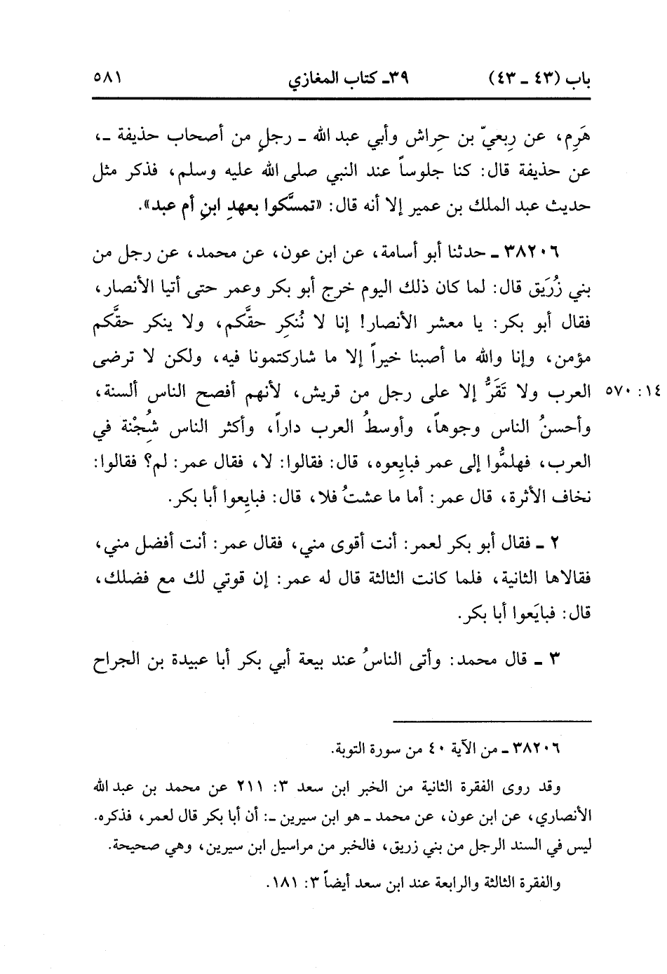 38206- حَدَّثَنَا أَبُو أُسَامَةَ ، عَنِ ابْنِ عَوْنٍ ، عَنْ مُحَمَّدٍ ، عَنْ رَجُلٍ مِنْ بَنِي زُرَيْقٍ ، قَالَ : لَمَّا كَانَ ذَلِكَ الْيَوْمُ خَرَجَ أَبُو بَكْرٍ ، وَعُمَرُ حَتَّى أَتَيَا الأَنْصَارَ ، فَقَالَ أَبُو بَكْرٍ : يَا مَعْشَرَ الأَنْصَارِ ، إِنَّا لاَ نُنْكِرُ حَقَّكُمْ ، وَلاَ يُنْكِرُ حَقَّكُمْ مُؤْمِنٌ ، وَإِنَّا وَاللهِ مَا أَصَبْنَا خَيْرًا إِلاَّ مَا شَارَكْتُمُونَا فِيهِ ، وَلَكِنْ لاَ تَرْضَى الْعَرَبُ (14/569) وَلاَ تُقِرُّ إِلاَّ عَلَى رَجُلٍ مِنْ قُرَيْشٍ ، لأَنَّهُمْ أَفْصَحُ النَّاسِ أَلْسِنَةً ، وَأَحْسَنُ النَّاسِ وُجُوهًا ، وَأَوْسَطُ الْعَرَبِ دَارًا ، وَأَكْثَرُ النَّاسِ شُِجِنةً فِي الْعَرَبِ ، فَهَلُمُّوا إِلَى عُمَرَ فَبَايِعُوهُ ، قَالَ : فَقَالُوا : لاَ ، فَقَالَ عُمَرُ : لِمَ ؟ فَقَالُوا : نَخَافُ الأَثَرَةَ ، قَالَ عُمَرُ : أَمَّا مَا عِشْتُ فَلاَ ، قَالَ : فَبَايِعُوا أَبَا بَكْرٍ.