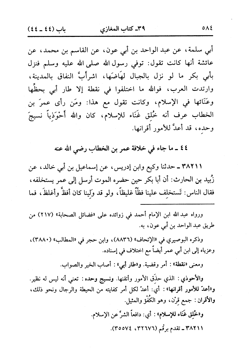 38210- حَدَّثَنَا يَزِيدُ بْنُ هَارُونَ ، عَنْ عَبْدِ الْعَزِيزِ بْنِ عَبْدِ اللهِ بْنِ أَبِي سَلَمَةَ ، عَنْ عَبْدِ الْوَاحِدِ بْنِ أَبِي عَوْنٍ ، عَنِ الْقَاسِمِ بْنِ مُحَمَّدٍ ، عَنْ عَائِشَةَ ، أَنَّهَا كَانَتْ تَقُولُ : تُوُفِّيَ رَسُولُ اللهِ صَلَّى الله عَلَيْهِ وَسَلَّمَ فَنَزَلَ بِأَبِي بَكْرٍ مَا لَوْ نَزَلَ بِالْجِبَالِ لَهَاضَهَا ، اشْرَأَبَّ النِّفَاقُ بِالْمَدِينَةِ ، وَارْتَدَّتِ الْعَرَبُ ، فَوَاللهِ مَا اخْتَلَفُوا فِي نُقْطَةٍ إِلاَّ طَارَ أَبِي بِحَظِّهَا وعَنَائِهَا فِي الإِسْلاَمِ ، وَكَانَتْ تَقُولُ مَعَ هَذَا : وَمَنْ رَأَى عُمَرَ بْنَ الْخَطَّابِ عَرَفَ أَنَّهُ خُلِقَ غِنَاءً لِلإِسْلاَمِ ، كَانَ وَاللهِ أَحْوَذِيًّا ، نَسِيجَ وَحْدِهُ ، قَدْ أَعَدَّ لِلأُمُورِ أَقْرَانَهَا. (14/572).