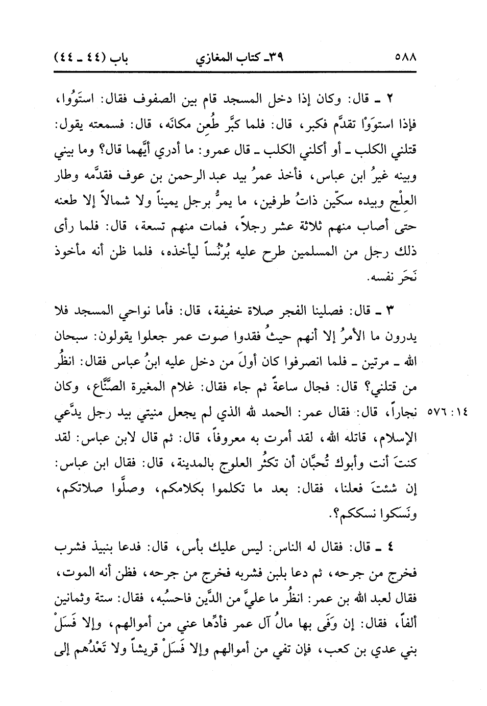 فَلَمَّا انْصَرَفُوا كَانَ أَوَّلَ مَنْ دَخَلَ عَلَيْهِ ابْنُ عَبَّاسٍ ، فَقَالَ : انْظُرْ مَنْ قَتَلَنِي ؟ قَالَ : فَجَالَ سَاعَةً ، ثُمَّ جَاءَ ، فَقَالَ : غُلاَمُ الْمُغِيرَةِ الصَّنَّاعُ ، وَكَانَ نَجَّارًا ، قَالَ : فَقَالَ عُمَرُ : الْحَمْدُ لِلَّهِ الَّذِي (14/575) لَمْ يَجْعَلْ مُنْيَتِي بِيَدِ رَجُلٍ يَدَّعِي الإِسْلاَمَ ، قَاتَلَهُ اللَّهُ ، لَقَدْ أَمَرْتُ بِهِ مَعْرُوفًا ، قَالَ : ثُمَّ قَالَ لاِبْنِ عَبَّاسٍ : لَقَدْ كُنْتَ أَنْتَ وَأَبُوك تُحِبَّانِ أَنْ تَكْثُرَ الْعُلُوج بِالْمَدِينَةِ ، قَالَ : فَقَالَ ابْنُ عَبَّاسٍ : إِنْ شِئْتَ فَعَلْنَا ، فَقَالَ : بَعْدَ مَا تَكَلَّمُوا بِكَلاَمِكُمْ وَصَلَّوْا صَلاَتَكُمْ وَنَسَكُوا نُسُكَكُمْ ؟.