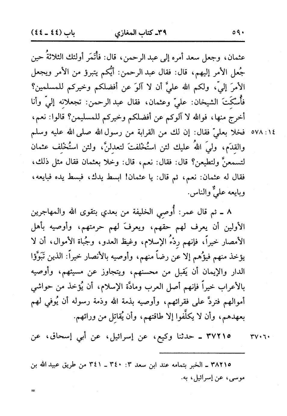 قَالَ : فَقَالَ عَبْدُ الرَّحْمَنِ : أَيُّكُمْ يَتَبَرَّأُ مِنَ الأَمْرِ وَيَجْعَلُ الأَمْرَ إِلَيَّ ، وَلَكُمُ اللَّهُ عَلَيَّ أَنْ لاَ آلُو عَنْ أَفْضَلِكُمْ وَخَيْرِكُمْ لِلْمُسْلِمِينَ ؟ فَأُسْكِتَ الشَّيْخَانِ عَلِيٌّ وَعُثْمَان ، فَقَالَ عَبْدُ الرَّحْمَنِ : تَجْعَلاَنِهِ إِلَيَّ وَأَنَا أَخْرُجُ مِنْهَا ، فَوَاللهِ لاَ آلُوكُمْ عَنْ أَفْضَلِكُمْ وَخَيْرِكُمْ لِلْمُسْلِمِينَ ؟ قَالَوا : نَعَمْ ، فَخَلاَ بِعَلِيٍّ ، فَقَالَ : إِنَّ لَك مِنَ الْقَرَابَةِ (14/577) مِنْ رَسُولِ اللهِ صَلَّى الله عَلَيْهِ وَسَلَّمَ وَالْقَدَمِ ، وَلِي اللَّهُ عَلَيْك لَئِنَ اسْتُخْلِفْتَ لَتَعْدِلَنَّ ، وَلَئِنَ اسْتُخْلِفَ عُثْمَان لَتَسْمَعْن وَلَتُطِيعُنَّ ؟ قَالَ : فَقَالَ : نَعَمْ ، قَالَ : وَخَلاَ بِعُثْمَانَ ، فَقَالَ : مِثْلَ ذَلِكَ ، فَقَالَ لَهُ عُثْمَان : نَعَمْ ، ثُمَّ قَالَ : يَا عُثْمَان ، أَبْسِطْ يَدَك ، فَبَسَطَ يَدَهُ فَبَايَعَهُ ، وَبَايَعَهُ عَلِيٌّ وَالنَّاسُ.