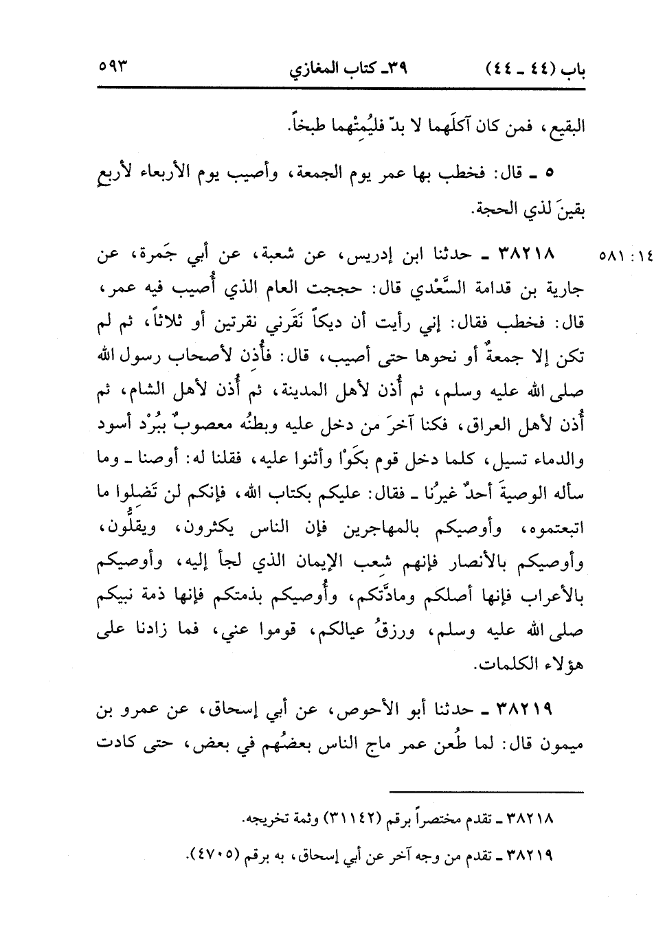 38218- حَدَّثَنَا ابْنُ إِدْرِيسَ ، عَنْ شُعْبَةَ ، عَنْ أَبِي جَمْرَةَ ، عَنْ جَارِيَةَ بْنِ قُدَامَةَ السَّعْدِيِّ ، قَالَ : حجَجْتُ الْعَامَ الَّذِي أُصِيبَ فِيهِ عُمَرُ ، قَالَ : فَخَطَبَ ، فَقَالَ : إِنِّي رَأَيْتُ أَنَّ دِيكًا نَقَرَنِي نَقْرَتَيْنِ ، أَوْ ثَلاَثًا ، ثُمَّ لَمْ تَكُنْ إِلاَّ جُمُعَةٌ ، أَوْ نَحْوَهَا حَتَّى أُصِيبَ ، قَالَ : فَأُذِنَ لأَصْحَابِ رَسُولِ اللهِ صَلَّى الله عَلَيْهِ وَسَلَّمَ ، ثُمَّ أُذِنَ لأَهْلِ الْمَدِينَةِ ، ثُمَّ أُذِنَ لأَهْلِ الشَّامِ ، ثُمَّ أُذِنَ لأَهْلِ الْعِرَاقِ ، فَكُنَّا آخِرَ مَنْ دَخَلَ عَلَيْهِ ، وَبَطْنُهُ مَعْصُوبٌ بِبُرْدٍ أَسْوَدَ ، وَالدِّمَاءُ تَسِيلُ ، كُلَّمَا دَخَلَ قَوْمٌ بَكَوْا وَأَثْنَوْا عَلَيْهِ ، فَقُلْنَا لَهُ : أَوْصِنَا ، وَمَا سَأَلَهُ الْوَصِيَّةَ أَحَدٌ غَيْرَنَا ، فَقَالَ : عَلَيْكُمْ بِكِتَابِ اللهِ ، فَإِنَّكُمْ لَنْ تَضِلُّوا مَا اتَّبَعْتُمُوهُ ، وَأُوصِيكُمْ بِالْمُهَاجِرِينَ ، فَإِنَّ النَّاسَ يَكْثُرُونَ وَيَقِلُّونَ ، وَأُوصِيكُمْ بِالأَنْصَارِ ، فَإِنَّهُمْ شِعَبُ الإِيمَانِ الَّذِي لَجَأَ إِلَيْهِ ، وَأُوصِيكُمْ بِالأَعْرَابِ فَإِنَّهَا أَصْلُكُمْ وَمَادَّتُكُمْ ، وَأُوصِيكُمْ بِذِمَّتِكُمْ ، فَإِنَّهَا ذِمَّةُ نَبِيِّكُمْ صَلَّى الله عَلَيْهِ وَسَلَّمَ ، وَرِزْقُ عِيَالِكُمْ ، قُومُوا عَنِّي ، فَمَا زَادَنَا عَلَى هَؤُلاَءِ الْكَلِمَاتِ. (14/581).
