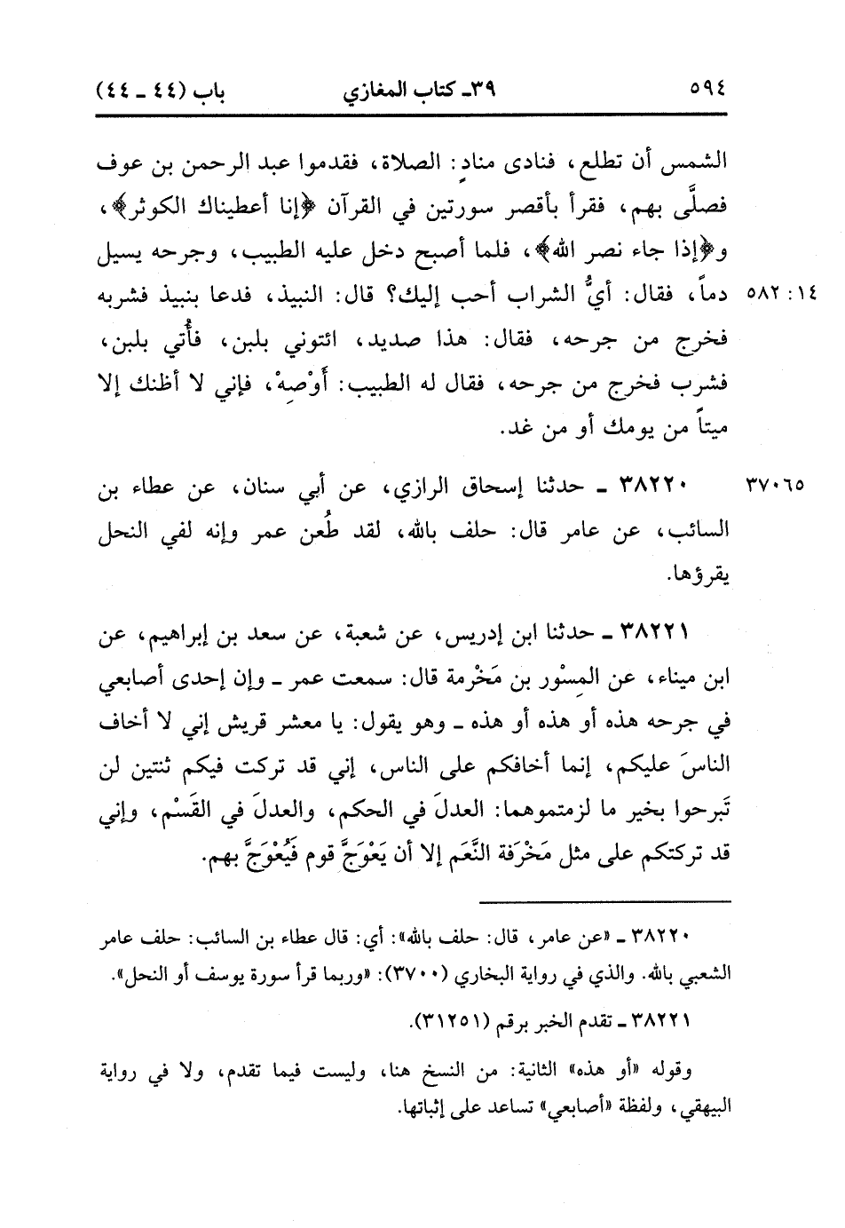38220- حَدَّثَنَا إِسْحَاقُ الرَّازِيّ ، عَنْ أَبِي سِنَانٍ ، عَنْ عَطَاءِ بْنِ السَّائِبِ ، عَنْ عَامِرٍ ، قَالَ : حَلفَ بِاللهِ ، لَقَدْ طُعَنْ عُمَرُ وَإِنَّهُ لَفِي النَّحْلِ يَقْرَؤُهَا.