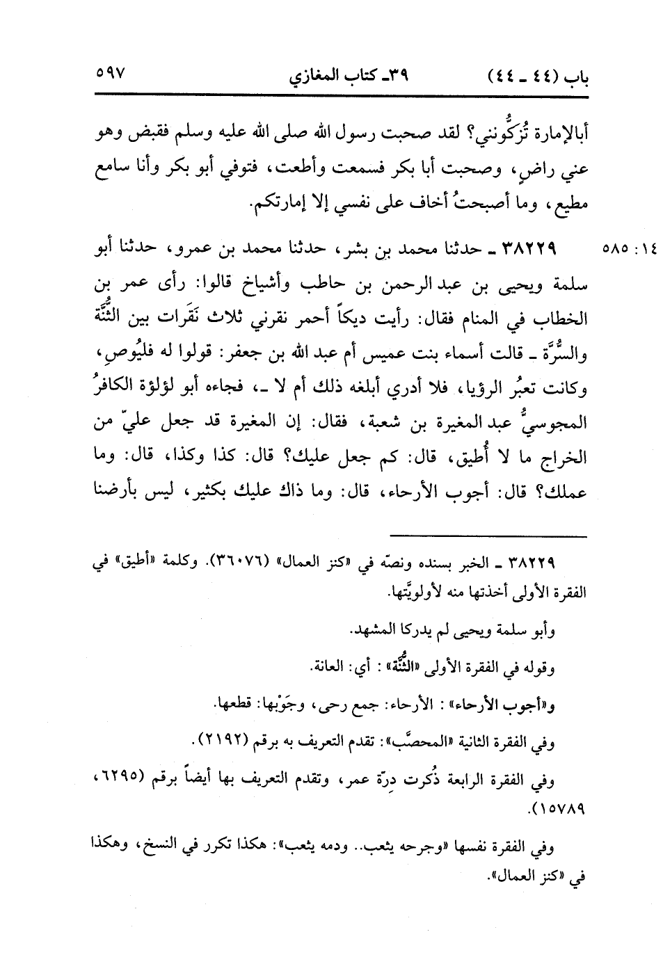 38229- حَدَّثَنَا مُحَمَّدُ بْنُ بِشْرٍ ، حَدَّثَنَا مُحَمَّدُ بْنُ عَمْرٍو ، حَدَّثَنَا أَبُو سَلَمَةَ ، وَيَحْيَى بْنُ عَبْدِ الرَّحْمَنِ بْنِ حَاطِبٍ ، وَأَشْيَاخٌ ، قَالَوا : رَأَى عُمَرُ بْنُ الْخَطَّابِ فِي الْمَنَامِ ، فَقَالَ : رَأَيْتُ دِيكًا أَحْمَرَ نَقَرَنِي ثَلاَثَ نَقَرَاتٍ ، بَيْنَ الثَّنِيَّةِ وَالسُّرَّةِ ، قَالَتْ أَسْمَاءُ بِنْتُ عُمَيْسٍ ، أُمُّ عَبْدِ اللهِ بْنِ جَعْفَرٍ : قُولُوا لَهُ فَلِيُوصِ ، وَكَانَتْ تَعْبُرُ الرُّؤْيَا ، فَلاَ أَدْرِي أَبَلَغَهُ ذَلِكَ ، أَمْ لاَ ، فَجَاءَهُ أَبُو لُؤْلُؤَةَ الْكَافِرُ الْمَجُوسِيُّ ، عَبْدُ الْمُغِيرَةِ بْنِ شُعْبَةَ ، فَقَالَ : إِنَّ الْمُغِيرَةَ قَدْ جَعَلَ عَلَيَّ مِنَ الْخَرَاجِ مَا لاَ أُطِيقُ ، قَالَ : كَمْ جَعَلَ عَلَيْك ؟ قَالَ : كَذَا وَكَذَا ، قَالَ : وَمَا عَمَلُك ؟ قَالَ : أَجُوبُ الأَرْحَاءَ ، قَالَ : وَمَا ذَاكَ عَلَيْك بِكَثِيرٍ ، لَيْسَ بِأَرْضِنَا أَحَدٌ يَعْمَلُهَا غَيْرُك ، أَلاَ تَصْنَعُ لِي رَحًى ؟ قَالَ : بَلَى ، وَاللهِ لأَجْعَلَنَّ لَك رَحًى يَسْمَعُ بِهَا أَهْلُ الآفَاقِ. (14/585).