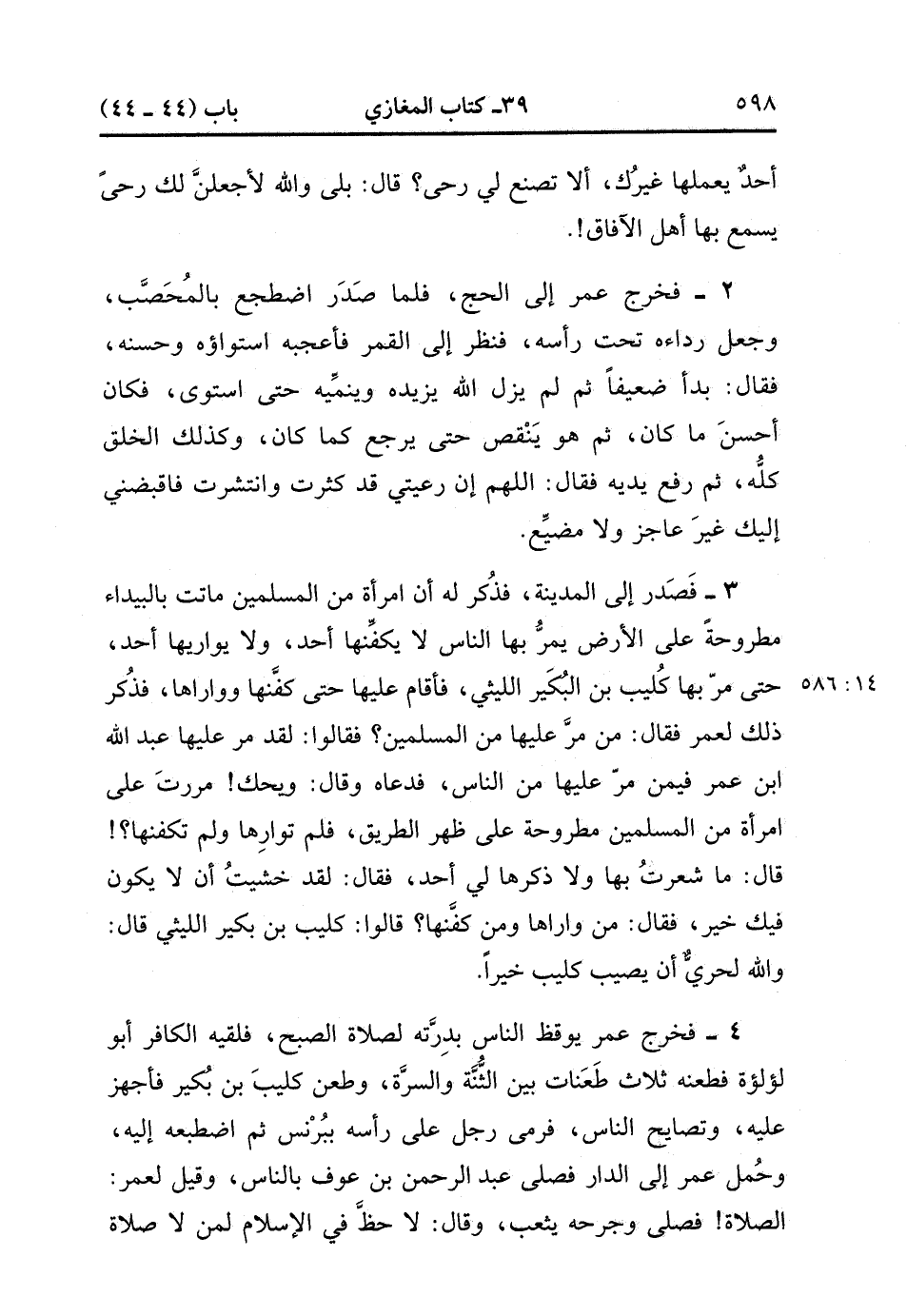 فَخَرَجَ عُمَرُ يُوقِظُ النَّاسَ بِدِرَّتِهِ لِصَلاَةِ الصُّبْحِ ، فَلَقِيَهُ الْكَافِرُ أَبُو لُؤْلُؤَةَ ، فَطَعَنْهُ ثَلاَثَ طَعَنْاتٍ بَيْنَ الثَّنِيَّةِ وَالسُّرَّةِ ، وَطَعَنْ كُلَيْبَ بْنَ بُكَيْر فَأَجْهَزَ عَلَيْهِ ، وَتَصَايَحَ النَّاسُ ، فَرَمَى رَجُلٌ عَلَى رَأْسِهِ بِبُرْنُسٍ ، ثُمَّ اضْطَبَعَهُ إِلَيْهِ ، وَحُمِلَ عُمَرُ إِلَى الدَّارِ ، فَصَلَّى عَبْدُ الرَّحْمَنِ بْنُ عَوْفٍ بِالنَّاسِ ، وَقِيلَ لِعُمَرَ : الصَّلاَةُ ،(14/586).