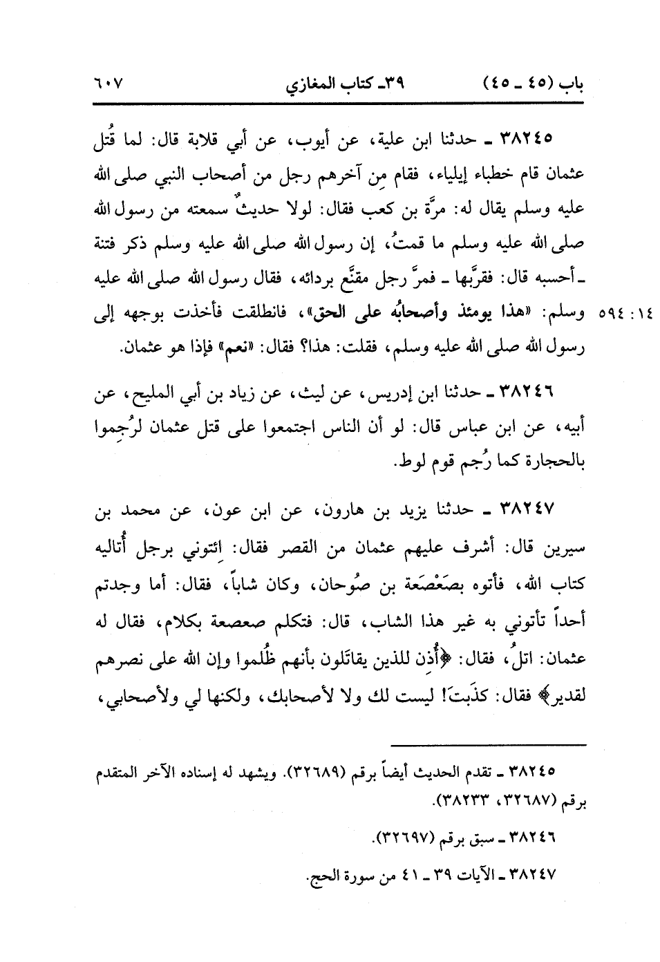 38247- حَدَّثَنَا يَزِيدُ بْنُ هَارُونَ ، عَنِ ابْنِ عَوْنٍ ، عَنْ مُحَمَّدِ بْنِ سِيرِينَ ، قَالَ : أَشْرَفَ عَلَيْهِمْ عُثْمَانُ مِنَ الْقَصْرِ ، فَقَالَ : ائْتُونِي بِرَجُلٍ أُتَالِيهِ كِتَابَ اللهِ ، فَأَتَوْهُ بِصَعْصَعَةَ بْنِ صُوحَانَ ، وَكَانَ شَابًّا ، فَقَالَ : أَمَا وَجَدْتُمْ أَحَدًا تَأْتُونِي بِهِ غَيْرَ هَذَا الشَّابِّ ، قَالَ : فَتَكَلَّمَ صَعْصَعَةُ بِكَلاَمٍ ، فَقَالَ لَهُ عُثْمَان : اتْلُ ، فَقَالَ : {أُذِنَ لِلَّذِينَ يُقَاتَلُونَ بِأَنَّهُمْ ظُلِمُوا ، وَإِنَّ اللَّهَ عَلَى نَصْرِهِمْ لَقَدِيرٌ} ، فَقَالَ : كَذَبْتَ ، لَيْسَتْ لَك ، وَلاَ لأَصْحَابِكَ ، وَلَكِنَّهَا لِي وَلأَصْحَابِي ، ثُمَّ تَلاَ عُثْمَان : {أُذِنَ لِلَّذِينَ يُقَاتَلُونَ بِأَنَّهُمْ ظُلِمُوا ، وَإِنَّ اللَّهَ عَلَى نَصْرِهِمْ لَقَدِيرٌ} حَتَّى بَلَغَ : {وَإِلَى اللهِ عَاقِبَةُ الأُمُورِ}.(14/594).