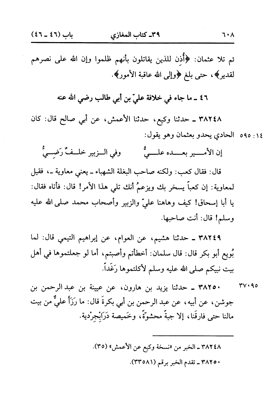 38248- حَدَّثَنَا وَكِيعٌ ، حَدَّثَنَا الأَعْمَشِ ، عَنْ أَبِي صَالِحٍ ، قَالَ : كَانَ الْحَادِي يَحْدُو بِعُثْمَانَ وَهُوَ يَقُولُ :