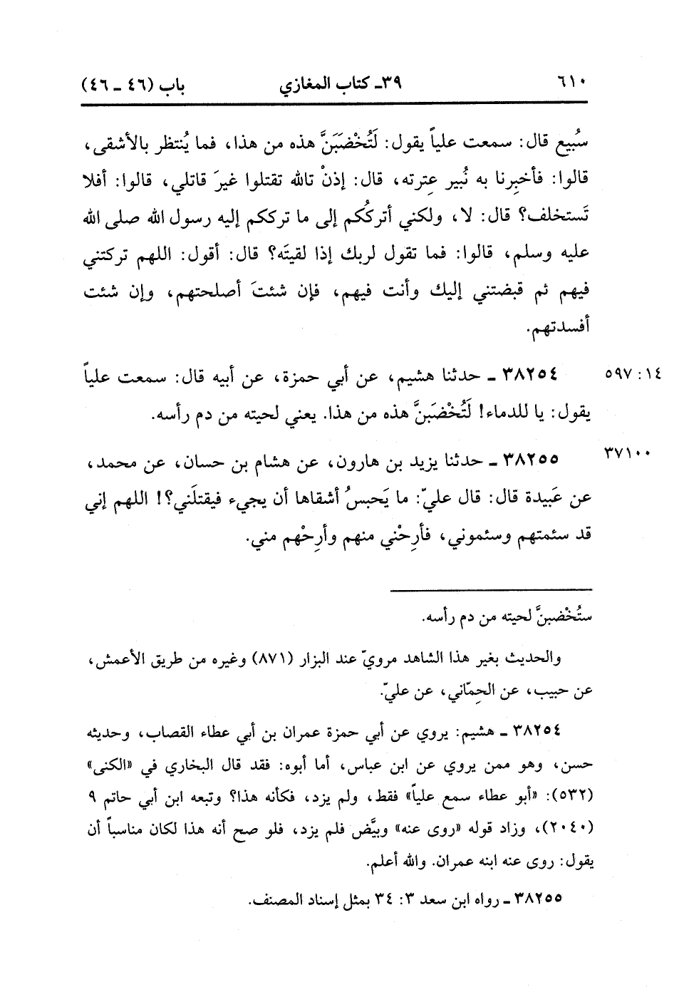 38253- حَدَّثَنَا وَكِيعٌ ، عَنِ الأَعْمَشِ ، عَنْ سَالِمٍ ، عَنْ عَبْدِ اللهِ بْنِ سُبَيْعٍ ، قَالَ : سَمِعْتُ عَلِيًّا يَقُولُ : لَتُخْضَبَنَّ هَذِهِ مِنْ هَذَا ، فَمَا يُنْتَظَرُ بِالأَشْقَى ، قَالَوا : فَأَخْبِرْنَا بِهِ نُبِيرُ عِتْرَتَهُ ، قَالَ : إِذًا تَاللهِ تَقْتُلُوا غَيْرَ قَاتِلِي ، قَالَوا : أَفَلاَ تَسْتَخْلِفْ ؟ قَالَ : لاَ ، وَلَكِنِّي أَتْرُكُكُمْ إِلَى مَا تَرَكَكُمْ إِلَيْهِ رَسُولُ اللهِ صَلَّى الله عَلَيْهِ وَسَلَّمَ ، قَالَوا : فَمَا تَقُولُ لِرَبِّكَ إِذَا لَقِيتَهُ ؟ قَالَ : أَقُولُ : اللَّهُمَّ تَرَكْتَنِي فِيهِمْ ، ثُمَّ قَبَضْتَنِي إِلَيْك وَأَنْتَ فِيهِمْ ، فَإِنْ شِئْتَ أَصْلَحْتَهُمْ ، وَإِنْ شِئْتَ أَفْسَدْتَهُمْ. (14/596)