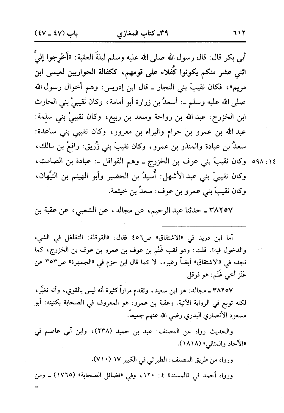 38257- حَدَّثَنَا عَبْدُ الرَّحِيمِ ، عَنْ مُجَالِدٍ ، عَنِ الشَّعْبِيِّ ، عَنْ عُقْبَةَ بْنِ عَمْرٍو الأَنْصَارِيِّ ، قَالَ : وَعَدَنَا رَسُولُ اللهِ صَلَّى الله عَلَيْهِ وَسَلَّمَ أَصْلَ الْعَقَبَةِ يَوْمَ الأَضْحَى ، وَنَحْنُ سَبْعُونَ رَجُلاً ، قَالَ عُقْبَةُ : إِنِّي مِنْ أَصْغَرِهِمْ ، فَأَتَانَا رَسُولُ اللهِ صَلَّى الله عَلَيْهِ وَسَلَّمَ ، فَقَالَ : أَوْجِزُوا فِي الْخُطْبَةِ ، فَإِنِّي أَخَافُ عَلَيْكُمْ كُفَّارَ قُرَيْشٍ ، قَالَ : قُلْنَا : يَا رَسُولَ اللهِ ، سَلْنَا لِرَبِّكَ ، وَسَلْنَا لِنَفْسِكَ ، وَسَلْنَا لأَصْحَابِكَ ، وَأَخْبِرْنَا مَا الثَّوَابُ عَلَى اللهِ وَعَلَيْكَ.