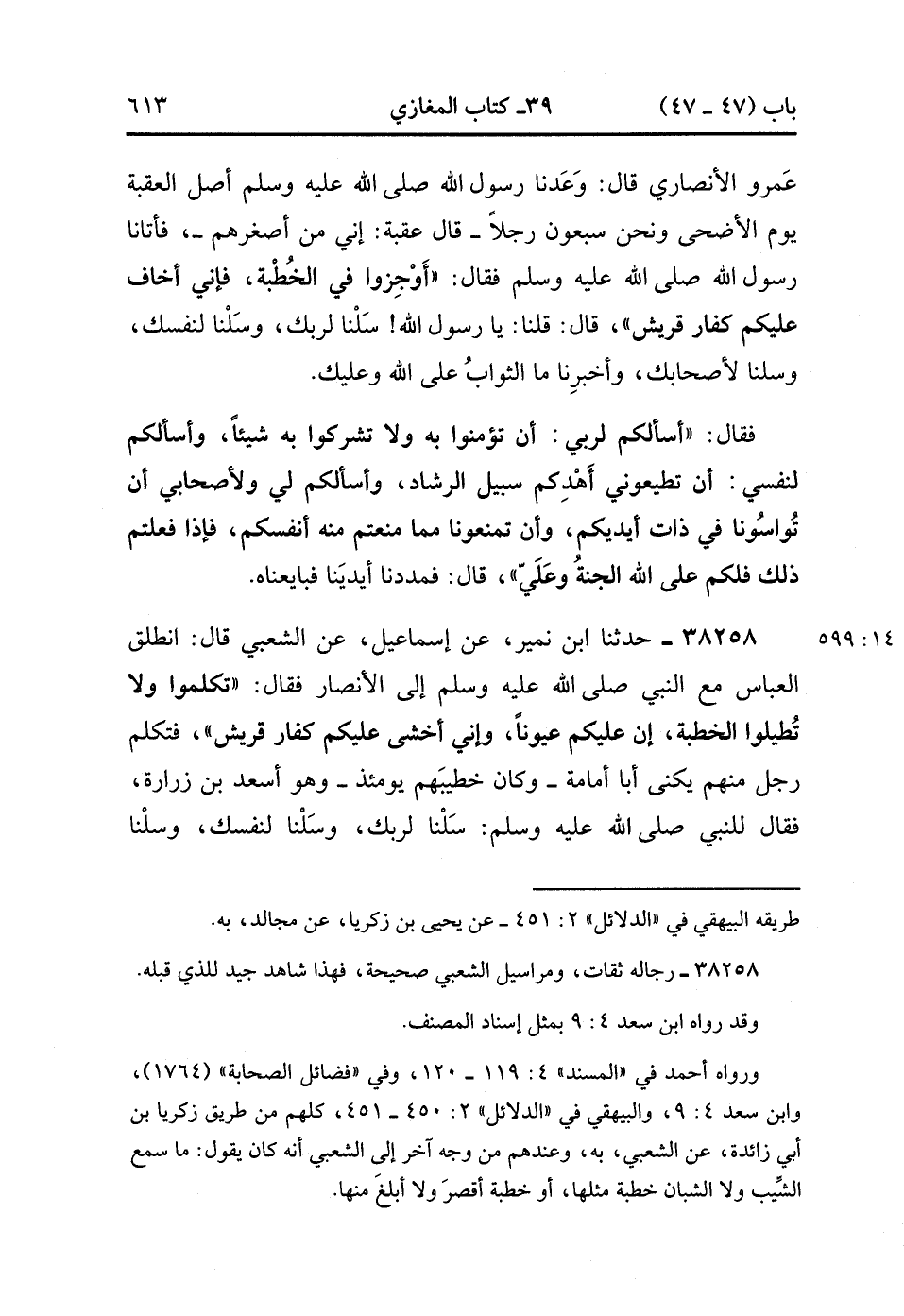 38258- حَدَّثَنَا ابْنُ نُمَيْرٍ ، عَنْ إِسْمَاعِيلَ ، عَنِ الشَّعْبِيِّ ، قَالَ : انْطَلَقَ الْعَبَّاسُ مَعَ النَّبِيِّ صَلَّى الله عَلَيْهِ وَسَلَّمَ إِلَى الأَنْصَارِ ، فَقَالَ : تَكَلَّمُوا وَلاَ تُطِيلُوا الْخُطْبَةَ ، إِنَّ عَلَيْكُمْ عُيُونًا ، وَإِنِّي أَخْشَى عَلَيْكُمْ كُفَّارَ قُرَيْشٍ ، فَتَكَلَّمَ رَجُلٌ مِنْهُمْ يُكَنَّى : أَبَا أُمَامَةَ ، وَكَانَ خَطِيبَهُمْ يَوْمَئِذٍ ، وَهُوَ أَسْعَدُ بْنُ زُرَارَةَ ، فَقَالَ لِلنَّبِيِّ صَلَّى الله عَلَيْهِ وَسَلَّمَ : سَلْنَا لِرَبِّكَ ، وَسَلْنَا لِنَفْسِكَ ، وَسَلْنَا لأَصْحَابِكَ ، وَمَا الثَّوَابُ عَلَى ذَلِكَ ؟ فَقَالَ النَّبِيُّ صَلَّى الله عَلَيْهِ وَسَلَّمَ : أَسْأَلُكُمْ لِرَبِّي أَنْ تَعْبُدُوهُ ، وَلاَ تُشْرِكُوا بِهِ شَيْئًا ، وَلِنَفْسِي أَنْ تُؤْمِنُوا بِي وَتَمْنَعُونِي مِمَّا تَمْنَعُونَ مِنْهُ أَنْفُسَكُمْ وَأَبْنَاءَكُمْ ، وَلأَصْحَابِي الْمُوَاسَاةَ فِي ذَاتِ أَيْدِيكُمْ ، قَالَوا : فَمَا لَنَا إِذَا فَعَلْنَا ذَلِكَ ؟ قَالَ : لَكُمْ عَلَى اللهِ الْجَنَّةُ. (14/599).