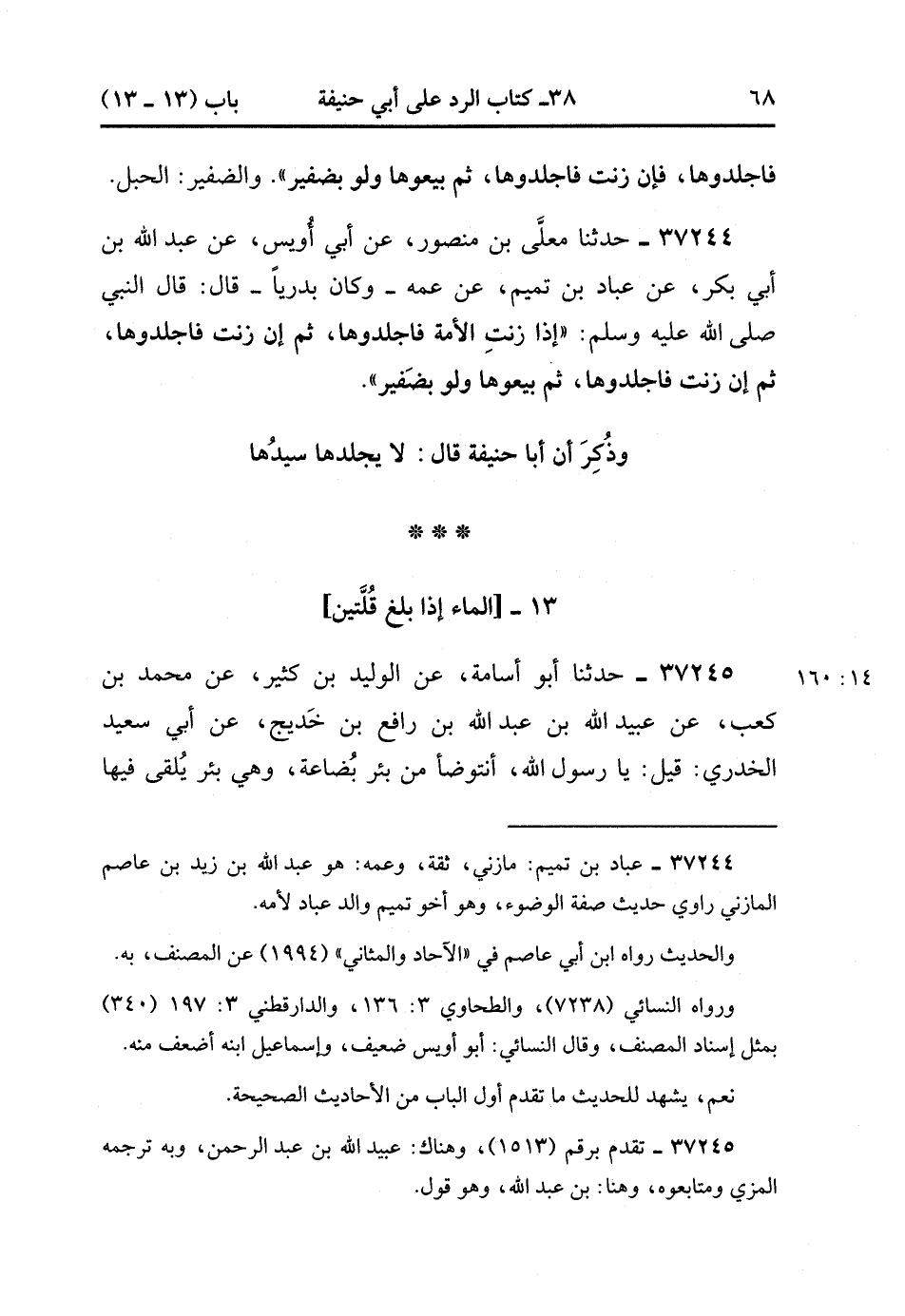 37245- حَدَّثَنَا أَبُو أُسَامَةَ ، عَنِ الْوَلِيدِ بْنِ كَثِيرٍ ، عَنْ مُحَمَّدِ بْنِ كَعْبٍ ، عَنْ عُبَيْدِ اللهِ بْنِ عَبْدِ اللهِ بْنِ رَافِعِ بْنِ خَدِيجٍ ، عَنْ أَبِي سَعِيدٍ الْخُدْرِيِّ ؛ قِيلَ : يَا رَسُولَ اللهِ ، أَنَتَوَضَّأُ مِنْ بِئْرِ بُضَاعَةَ ، وَهِيَ بِئْرٌ يُلْقَى فِيهَا الْحِيَضُ وَلُحُومُ الْكِلاَبِ وَالنَّتِنُ ؟ فَقَالَ النَّبِيُّ صَلَّى الله عَلَيْهِ وَسَلَّمَ : الْمَاءُ طَهُورٌ ، لاَ يُنَجِّسُهُ شَيْءٌ. (14/160).