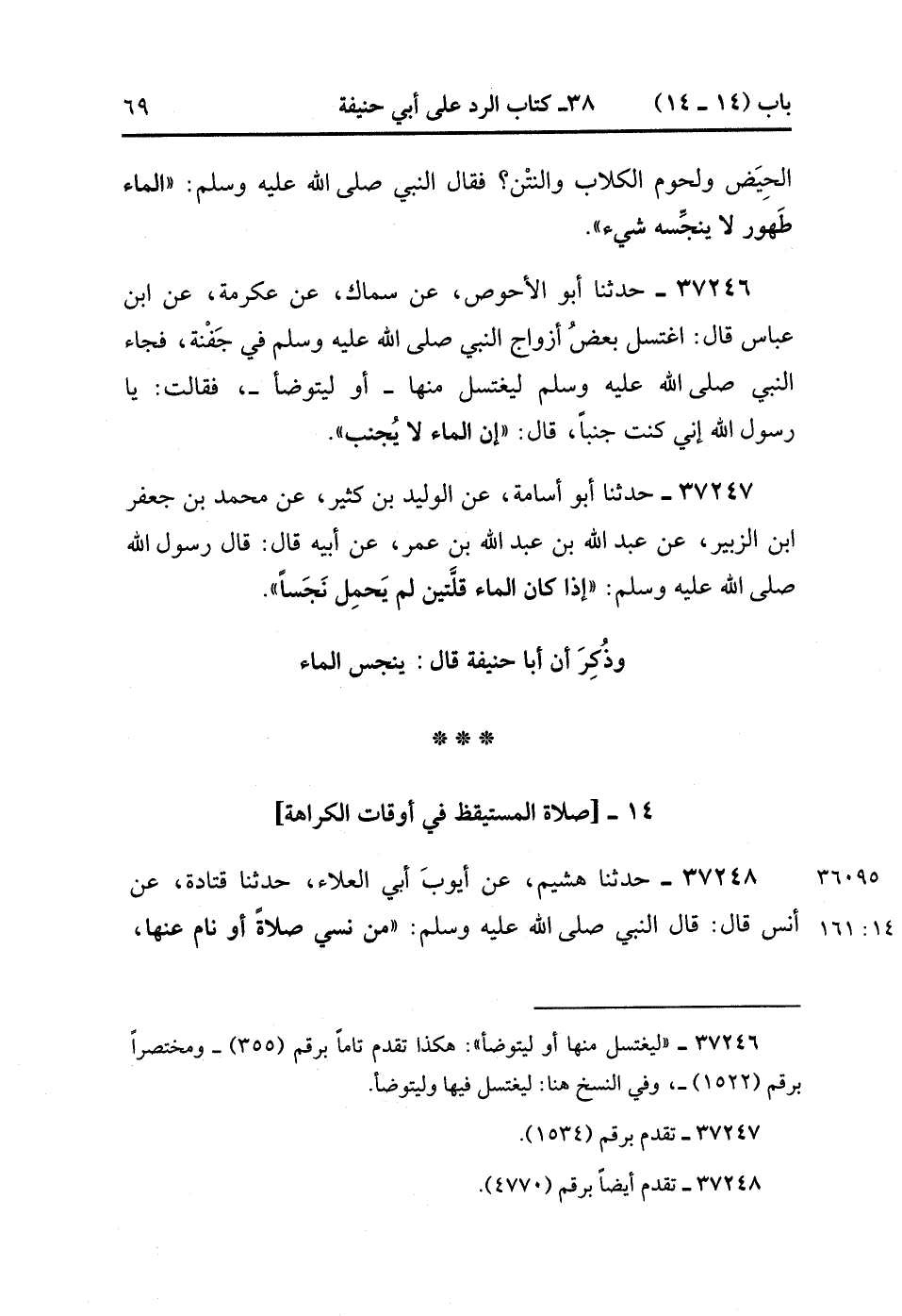 37246- حَدَّثَنَا أَبُو الأَحْوَصِِ ، عَنْ سِمَاكٍ ، عَنْ عِكْرِمَةَ ، عَنِ ابْنِ عَبَّاسٍ ، قَالَ : اغْتَسَلَ بَعْضُ أَزْوَاجِ النَّبِيِّ صَلَّى الله عَلَيْهِ وَسَلَّمَ فِي جَفْنَةٍ ، فَجَاءَ النَّبِيُّ صَلَّى الله عَلَيْهِ وَسَلَّمَ لِيَغْتَسِلَ مِنْهَا ، أَوْ لِيَتَوَضَّأَ ، فَقَالَتْ : يَا رَسُولَ اللهِ ، إِنِّي كُنْتُ جُنُبًا ، قَالَ : إِنَّ الْمَاءَ لاَ يُجْنِبُ.