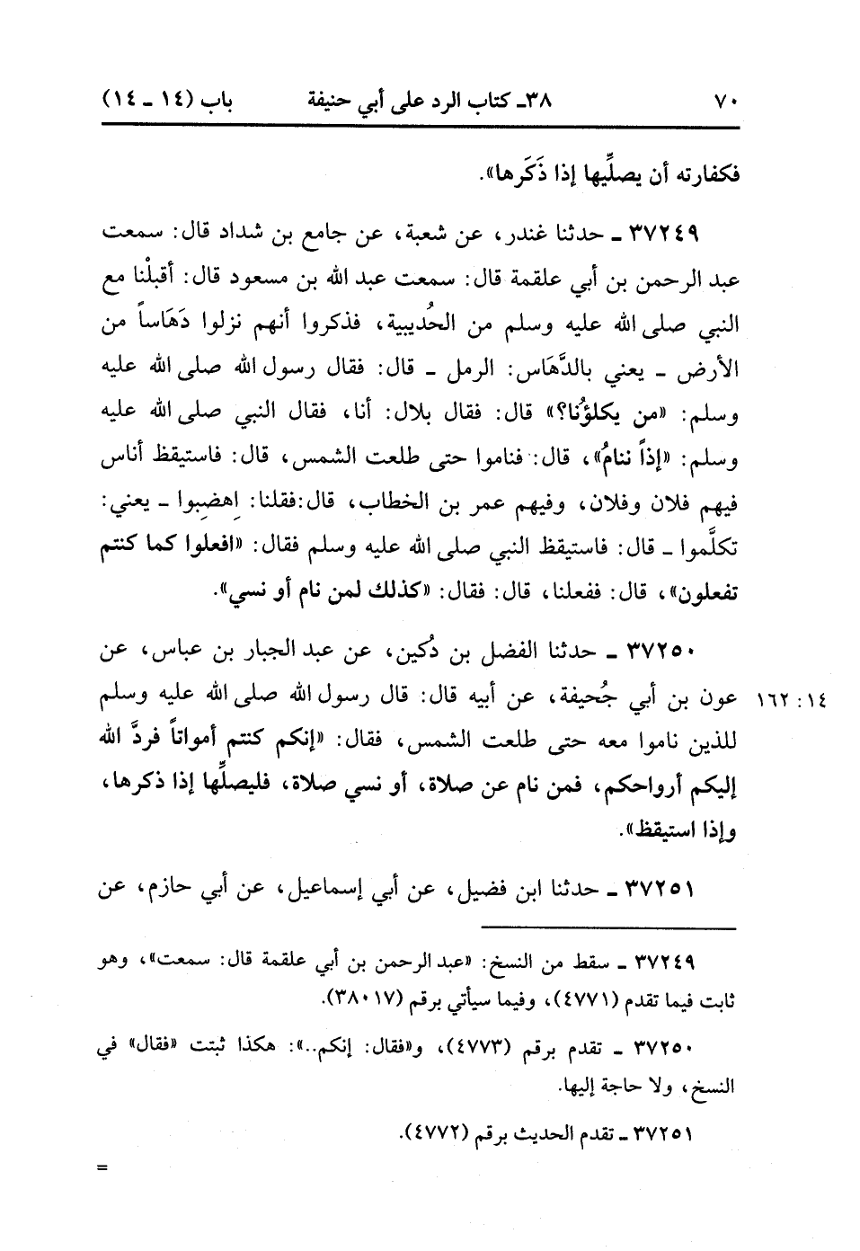 37250- حَدَّثَنَا الْفَضْلُ بْنُ دُكَيْنٍ ، عَنْ عَبْدِ الْجَبَّارِ بْنِ عَبَّاسٍ ، عَنْ عَوْنِ بْنِ أَبِي جُحَيْفَةَ ، عَنْ أَبِيهِ ، قَالَ : قَالَ رَسُولُ اللهِ صَلَّى الله عَلَيْهِ وَسَلَّمَ لِلَّذِينَ نَامُوا مَعَهُ حَتَّى طَلَعَتِ الشَّمْسُ ، فَقَالَ : إِنَّكُمْ كُنْتُمْ أَمْوَاتًا فَرَدَّ اللَّهُ إِلَيْكُمْ أَرْوَاحَكُمْ ، فَمَنْ نَامَ عَنْ صَلاَةٍ ، أَوْ نَسِيَ صَلاَةً ، فَلْيُصَلِّهَا إِذَا ذَكَرَهَا ، وَإِذَا اسْتَيْقَظَ. (14/161).