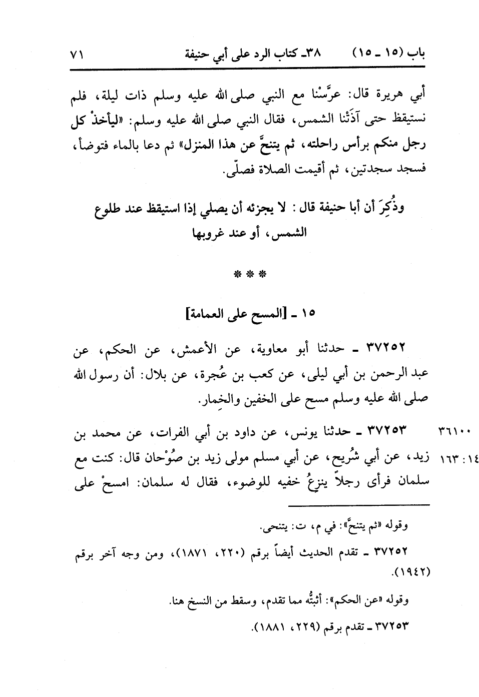 37253- حَدَّثَنَا يُونُسُ ، عَنْ دَاوُدَ بْنِ أَبِي الْفُرَاتِ ، عَنْ مُحَمَّدِ بْنِ زَيْدٍ ، عَنْ أَبِي شُرَيْحٍ ، عَنْ أَبِي مُسْلِمٍ مَوْلَى زَيْدِ بْنِ صُوحَانَ ، قَالَ : كُنْتُ مَعَ سَلْمَانَ فَرَأَى رَجُلاً يَنْزِعُ خُفَّيْهِ لِلْوُضُوءِ ، فَقَالَ لَهُ سَلْمَانُ : امْسَحْ عَلَى خُفَّيْك وَعَلَى خِمَارِكَ ، وَامْسَحْ بِنَاصِيَتِكَ ، فَإِنِّي رَأَيْتُ رَسُولَ اللهِ صَلَّى الله عَلَيْهِ وَسَلَّمَ يَمْسَحُ عَلَى الْخُفَّيْنِ وَالْخِمَارِ. (14/163).