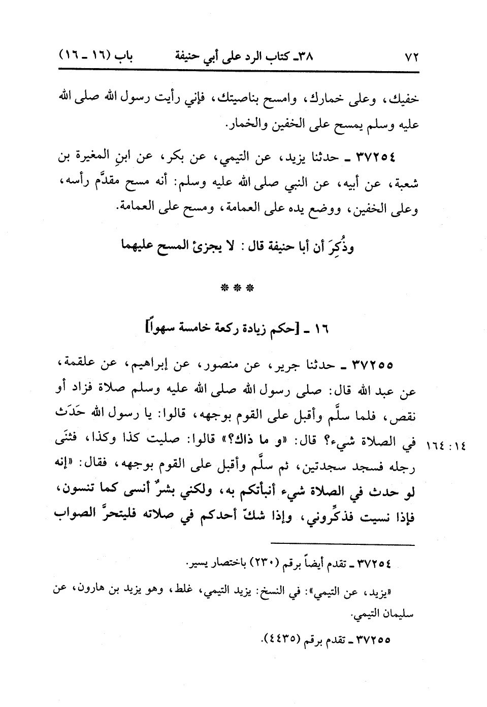37255- حَدَّثَنَا جَرِيرٌ ، عَنْ مَنْصُورٍ ، عَنْ إِبْرَاهِيمَ ، عَنْ عَلْقَمَةَ ، عَنْ عَبْدِ اللهِ ، قَالَ : صَلَّى رَسُولُ اللهِ صَلَّى الله عَلَيْهِ وَسَلَّمَ صَلاَةً فَزَادَ ، أَوْ نَقَصَ ، فَلَمَّا سَلَّمَ وَأَقْبَلَ عَلَى الْقَوْمِ بِوَجْهِهِ ، قَالُوا : يَا رَسُولَ اللهِ ، حَدَثَ فِي الصَّلاَةِ شَيْءٌ ؟ قَالَ : وَمَا ذَاكَ ؟ قَالُوا : صَلَّيْت كَذَا وَكَذَا ، فَثَنَى رِجْلَهُ فَسَجَدَ سَجْدَتَيْنِ ، ثُمَّ سَلَّمَ وَأَقْبَلَ عَلَى الْقَوْمِ بِوَجْهِهِ ، فَقَالَ : إِنَّهُ لَوْ حَدَثَ فِي الصَّلاَةِ شَيْءٌ أَنْبَأْتُكُمْ بِهِ ، وَلَكِنِّي بَشَرٌ أَنْسَى كَمَا تَنْسَوْنَ ، فَإِذَا نَسِيتُ فَذَكِّرُونِي ، وَإِذَا شَكَّ أَحَدُكُمْ فِي صَلاَتِهِ فَلْيَتَحَرَّ الصَّوَابَ فَلْيُتِمَّ عَلَيْهِ ، فَإِذَا سَلَّمَ سَجَدَ سَجْدَتَيْنِ. (14/163).