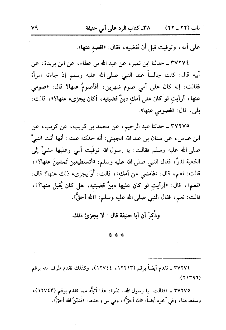 37275- حَدَّثَنَا عَبْدُ الرَّحِيمِ ، عَنْ مُحَمَّدِ بْنِ كُرَيْبٍ ، عَنْ كُرَيْبٍ ، عَنِ ابْنِ عَبَّاسٍ ، عَنْ سِنَانِ بْنِ عَبْدِ اللهِ الْجُهَنِيِّ ، أَنَّهُ حَدَّثَتْهُ عَمَّتُهُ ؛ أَنَّهَا أَتَتِ النَّبِيَّ صَلَّى الله عَلَيْهِ وَسَلَّمَ ، فَقَالَتْ : يَا رَسُولَ اللهِ ، تُوُفِّيَتْ أُمِّي وَعَلَيْهَا مَشْيٌ إِلَى الْكَعْبَةِ نَذْرًا ، فَقَالَ النَّبِيُّ صَلَّى الله عَلَيْهِ وَسَلَّمَ : أَتَسْتَطِيعِينَ تَمْشِينَ عَنْهَا ؟ قَالَتْ : نَعَمْ ، قَالَ : فَامْشِي عَنْ أُمِّكِ ، قَالَتْ : أَوَ يُجْزِئُ ذَلِكَ عَنْهَا ؟ قَالَ : نَعَمْ ، قَالَ : أَرَأَيْتِ لَوْ كَانَ عَلَيْهَا دَيْنٌ قَضَيْتِيهِ ، هَلْ كَانَ يُقْبَلُ مِنْها ؟ قَالَتْ : نَعَمْ ، فَقَالَ النَّبِيُّ صَلَّى الله عَلَيْهِ وَسَلَّمَ : الله أَحَقَّ.