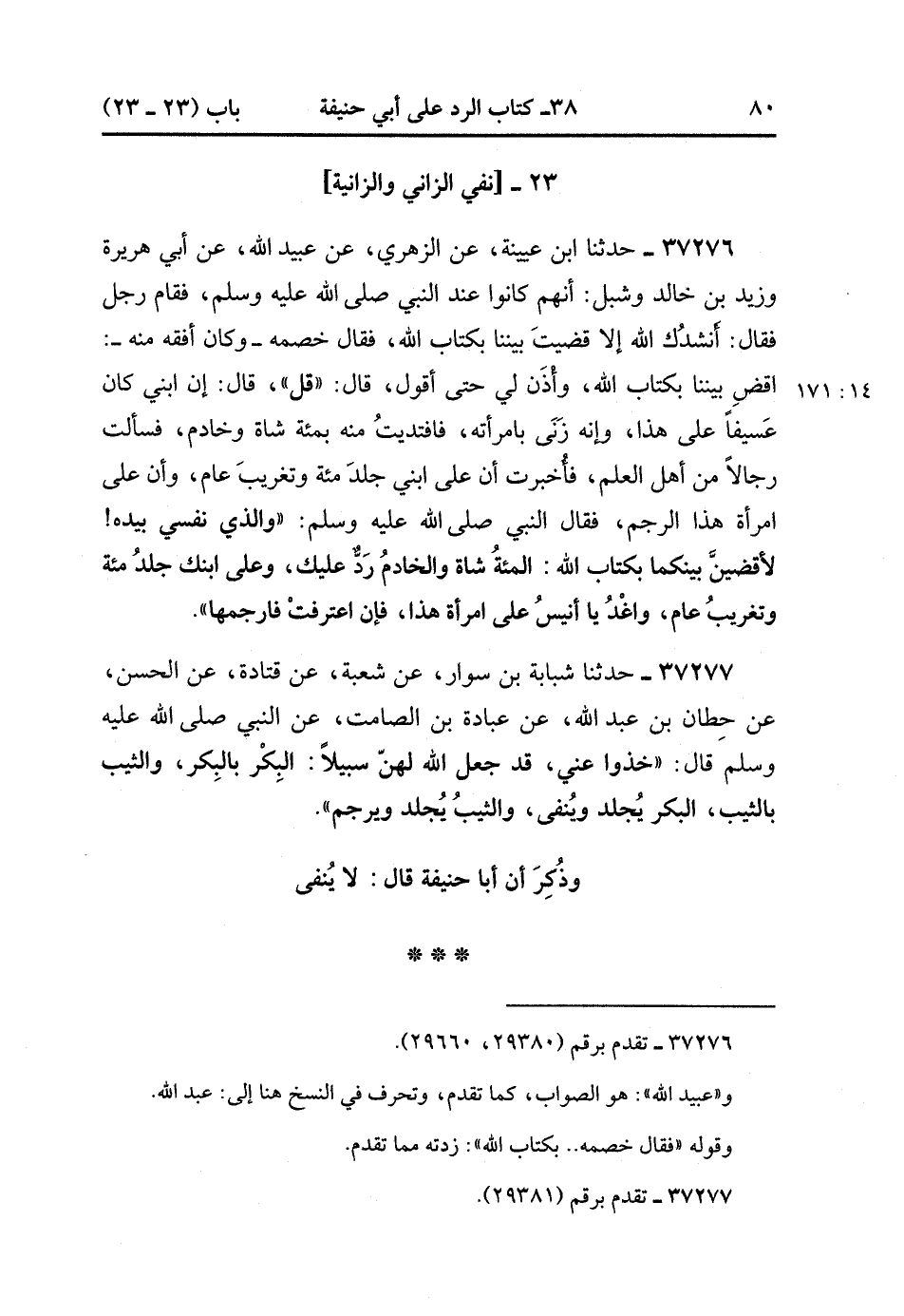 37276- حَدَّثَنَا ابْنُ عُيَيْنَةَ ، عَنِ الزُّهْرِيِّ ، عَنْ عُبَيْدِ اللهِ ، عَنْ أَبِي هُرَيْرَةَ ، وَزَيْدِ بْنِ خَالِدٍ ، وَشِبْلٍ ؛ أَنَّهُمْ كَانُوا عِنْدَ النَّبِيِّ صَلَّى الله عَلَيْهِ وَسَلَّمَ ، فَقَامَ رَجُلٌ ، فَقَالَ : أَنْشُدُك اللَّهَ إِلاَ قَضَيْتَ بَيْنَنَا بِكِتَابِ اللهِ ، فَقَالَ خَصْمُهُ ، وَكَانَ أَفْقَهَ مِنْهُ : اقْضِ بَيْنَنَا بِكِتَابِ اللهِ ، وَأْذَنْ لِي حَتَّى أَقُولَ ، قَالَ : قُلْ ، قَالَ : إِنَّ ابْنِي كَانَ عَسِيفًا عَلَى هَذَا ، وَإِنَّهُ زَنَى بِامْرَأَتِهِ ، فَافْتَدَيْتُ مِنْهُ بِمِئَةِ شَاةٍ وَخَادِمٍ ، فَسَأَلْتُ رِجَالاً مِنْ أَهْلِ الْعِلْمِ ، فَأُخْبِرْتُ أَنَّ عَلَى ابْنِي جَلْدَ مِئَةٍ وَتَغْرِيبَ عَامٍ ، وَأَنَّ عَلَى امْرَأَةِ هَذَا الرَّجْمَ ، فَقَالَ النَّبِيُّ صَلَّى الله عَلَيْهِ وَسَلَّمَ : وَالَّذِي نَفْسِي بِيَدِهِ ، لأَقْضِيَنَّ بَيْنَكُمَا بِكِتَابِ اللهِ : الْمِئَةُ شَاةٍ وَالْخَادِمُ رَدٌّ عَلَيْك ، وَعَلَى ابْنِكَ جَلْدُ مِئَةٍ وَتَغْرِيبُ عَامٍ ، وَاغْدُ يَا أُنَيْسُ عَلَى امْرَأَةِ هَذَا ، فَإِنَ اعْتَرَفَتْ فَارْجُمْهَا. (14/170)