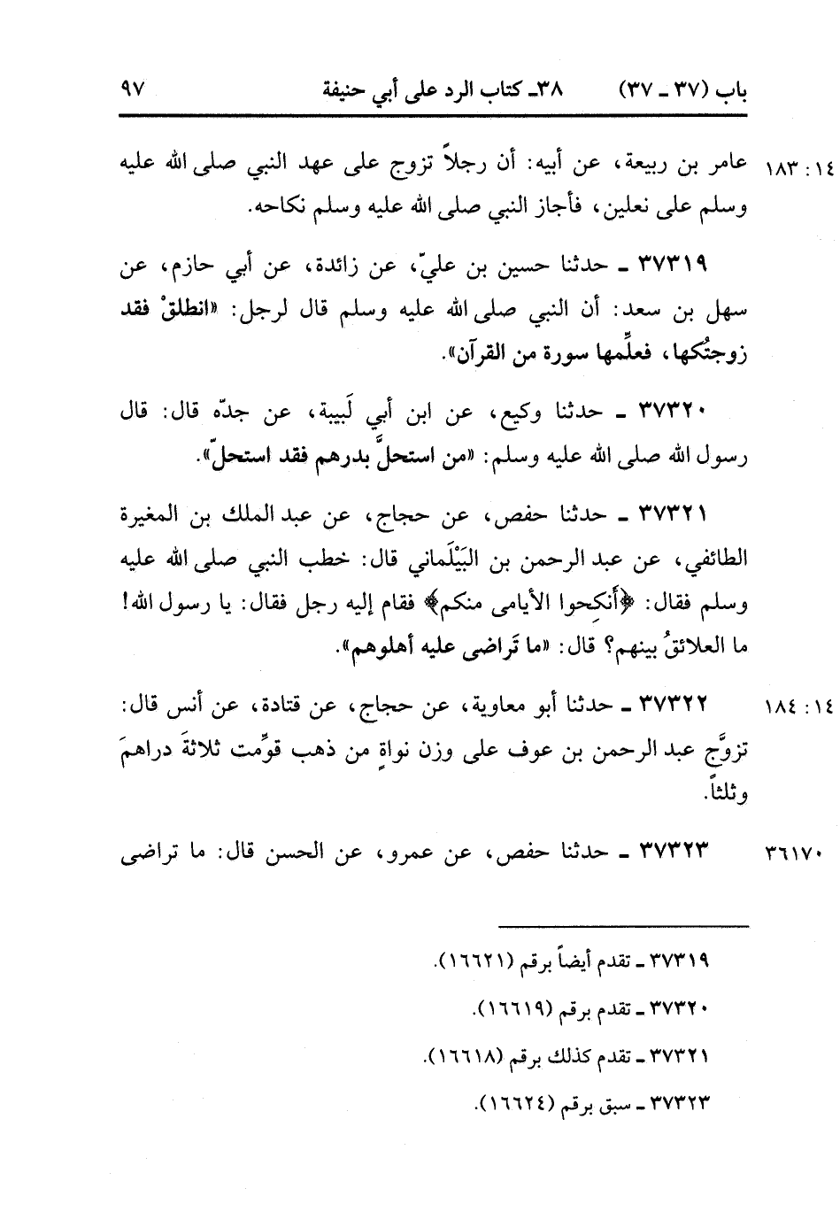 37319- حَدَّثَنَا حُسَيْنُ بْنُ عَلِيٍّ ، عَنْ زَائِدَةَ ، عَنْ أَبِي حَازِمٍ ، عَنْ سَهْلِ بْنِ سَعْدٍ ؛ أَنَّ النَّبِيَّ صَلَّى الله عَلَيْهِ وَسَلَّمَ ، قَالَ لِرَجُلٍ : انْطَلِقْ فَقَدْ زَوَّجْتُكُهَا ، فَعَلِّمْهَا سُورَةً مِنَ الْقُرْآنِ.