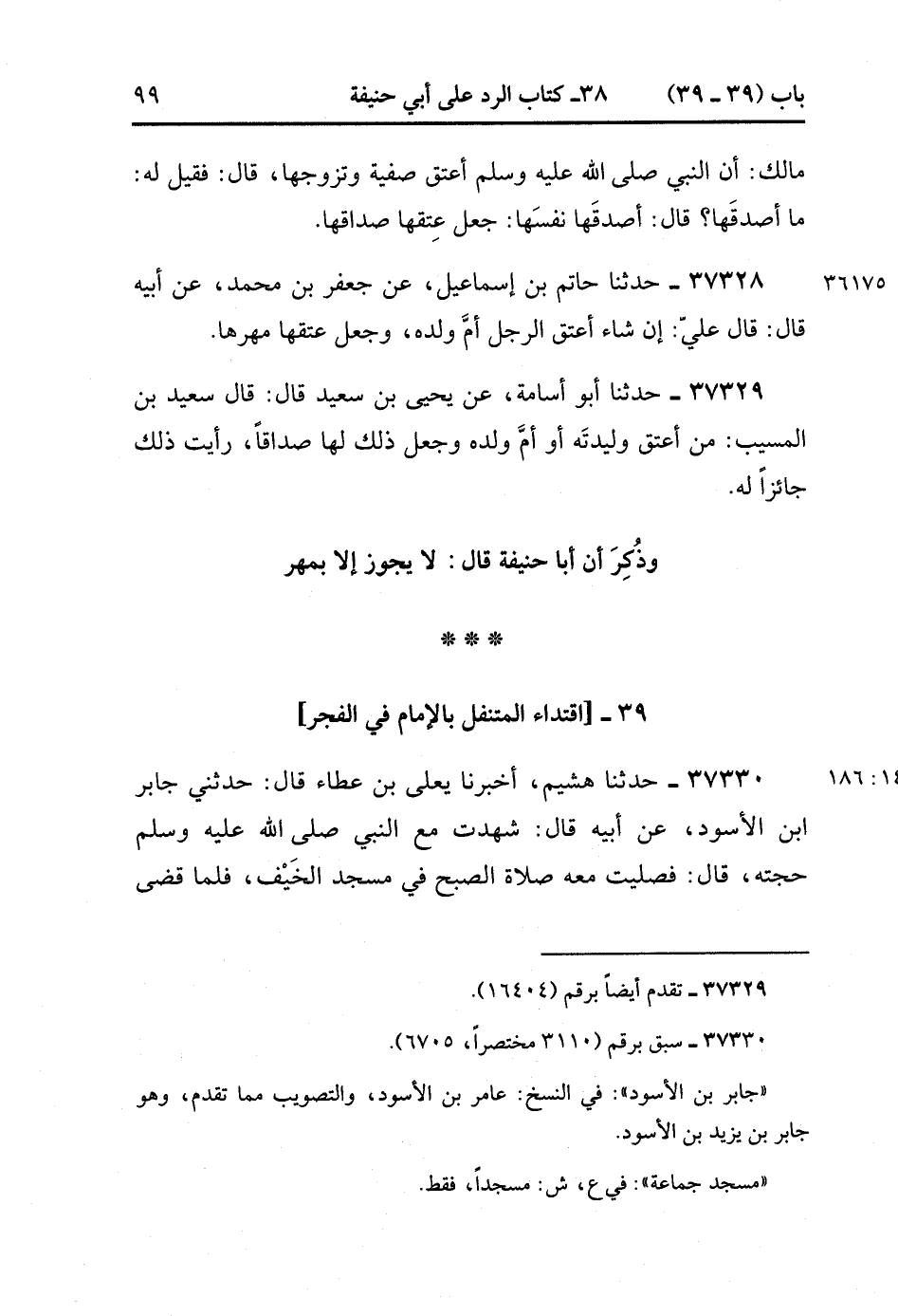 - وَذُكِرَ أَنَّ أَبَا حَنِيفَةَ قَالَ : لاَ يَجُوزُ إِلاَّ بِمَهْرٍ. (14/185)